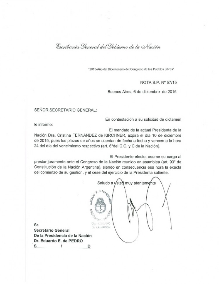 La Escribanía General de la Nación emitió un dictamen que establece que la finalización del mandato de la presidenta Cristina Kirchner "expira a la hora  24" del 10 de diciembre y que el nuevo Jefe de Estado, Mauricio Macri, asumirá su cargo "cuando preste juramento en el Congreso nacional".   "El mandato de la actual presidenta de la Nación, Cristina Fernández de Kirchner, expira el 10 de diciembre de 2015, pues los plazos de años se cuentan de fecha a fecha y vencen a la hora 24 del día de vencimiento respectivo", sostuvo el dictamen que el organismo firmó con fecha 6 de diciembre en respuesta al pedido del secretario general de la Presidencia, Eduardo "Wado" de Pedro.   Asimismo, agregó que "el presidente electo asume su cargo al prestar juramento ante el Congreso reunido en asamblea" y que "en consecuencia" es "esa hora la exacta del comienzo de su gestión y el cese del ejercicio de la presidenta saliente".   De Pedro destacó que el Gobierno nacional decidió requerir a la Escribanía General de la Nación una resolución porque "funcionarios del próximo gobierno estaban diciendo que iban a tomar el control de las fuerzas de seguridad desde las 0 del día 10", lo que definió como una "situación muy grave".  De esta manera, el diferendo entre las autoridades nacionales salientes y entrantes por el escenario de traspaso parecería haberse zanjado a favor de la postura del kirchnerismo, que determinó que la transferencia de los atributos se haga en el Congreso (tal como se hizo en 2003, 2007 y 2011) y no en la Casa Rosada, como pretendía el macrismo.   El dictamen se contrapone a la versión difundida por los referentes de Cambiemos, quienes sostenían que el mandato de Mauricio Macri comienza a las 00.00 del mismo 10 de diciembre, y que por ende era quien estaba en condiciones de determinar la forma en que iba a tener lugar la ceremonia.   Sin embargo, y pese al dictamen que lleva su firma, el titular de la Escribanía General, Natalio Etchegaray, afirmó este lunes en declaraciones a radio Vorterix que la "tradición" es que el traspaso de los atributos presidenciales (banda y bastón) se efectúe en la Casa Rosada.   Al respecto, apuntó: "El presidente y el vice juran en el Congreso y ya es Presidente. Después, la tradición indica, y se hizo así hasta que (Eduardo) Duhalde entregó a (Néstor)  Kirchner, y Néstor a Cristina (Fernández), se hizo en la Rosada. En estos (últimos) dos casos se hizo en el Congreso".   "En la normalidad, siempre se ha hecho, menos los dos últimos, esa entrega, que no está en la Constitución, pero es la costumbre, en la Casa Rosada", insistió.   En ese marco, el funcionario sostuvo que la controversia entre la gestión saliente y la entrante "no es un problema legal" sino "un problema de buenos modales".   Para graficar su concepto, explicó la mecánica se traspaso a través de una analogía con la transferencia de un inmueble del vendedor al comprador. "Es como cuando se compra una casa. Se firma el boleto y uno ya es el dueño, pero las llaves se las pueden dar en el momento o en la casa", ilustró.