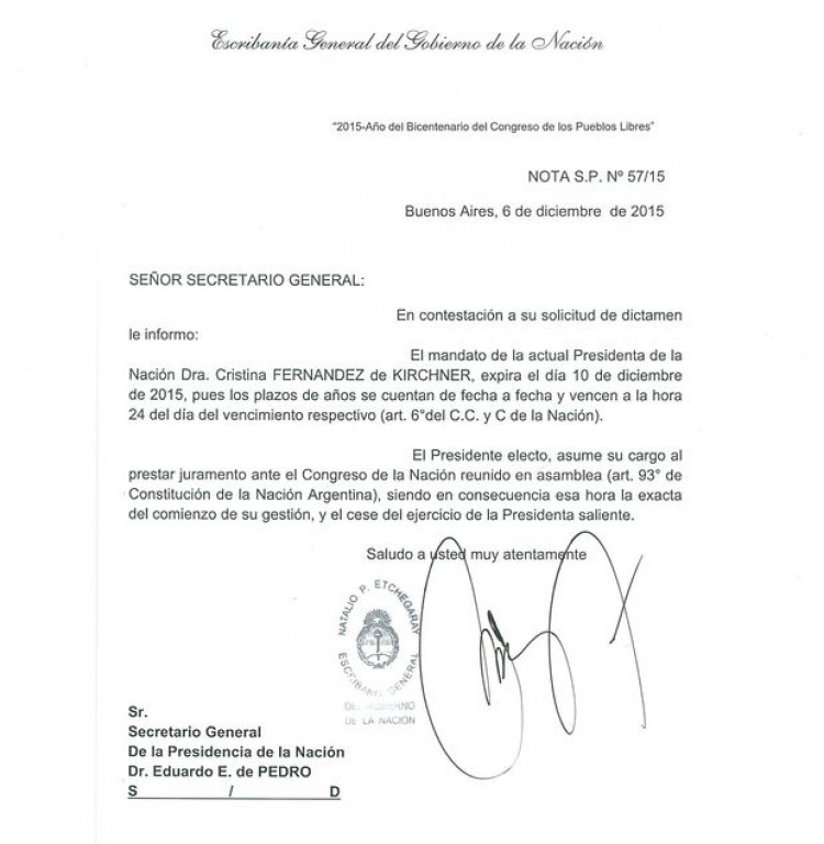 En medio de la pulseada por el traspaso de mando, la Escribanía General de la Nación informó que el mandato de Cristina Kirchner "expira a la hora 24" del jueves 10 de diciembre y que Mauricio Macri, asumirá su cargo sólo "cuando preste juramento en el Congreso Nacional", con lo que respaldó la postura de la Presidenta, aunque reconoció que la "tradición" es que la ceremonia se realice en la Casa Rosada."El mandato de la actual Presidenta de la Nación, Cristina Fernández de Kirchner, expira el 10 de diciembre de 2015, pues los plazos de años se cuentan de fecha a fecha y vencen a la hora 24 del día de vencimiento respectivo", sostuvo el dictamen que el organismo firmó con fecha 6 de diciembre en respuesta al pedido del secretario general de la Presidencia, Eduardo "Wado" de Pedro.Asimismo, agregó que "el presidente electo asume su cargo al prestar juramento ante el Congreso reunido en asamblea", y que "en consecuencia" es "esa hora la exacta del comienzo de su gestión y el cese del ejercicio de la presidenta saliente".Por su parte, la presidenta Kirchner fue abordada por la prensa este lunes feriado cuando salía de su departamento en el barrio porteño de Recoleta y, ante la pregunta de cómo y dónde se hará la entrega de la banda y el bastón, se limitó a responder: "Vamos a hacer lo que diga la Constitución".Mientras continúan las negociaciones entre funcionarios salientes y entrantes, De Pedro destacó que el gobierno nacional decidió requerir a la Escribanía General de la Nación una resolución porque "funcionarios del próximo Gobierno estaban diciendo que iban a tomar el control de las fuerzas de seguridad desde las 0 del día 10", lo que definió como una "situación muy grave".Fuente: Agencia de Noticias NA
