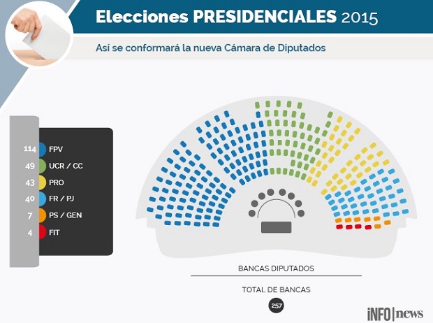 Es que el pasado 25 de octubre, si bien la fórmula presidencial del Frente para la Victoria no obtuvo los resultados esperados, logró consolidar su condición de fuerza mayoritaria en la Cámara de Diputados y en la de Senadores.SenadoEl Frente para la Victoria mantendrá una amplia mayoría en el Senado, donde contará con quórum propio ya que, según los resultados, está superando los 37 legisladores propios que se incorporarán a la Cámara alta a partir del 10 de diciembre.Esa fuerza política obtuvo el triunfo en Santa Fe, Catamarca, Chubut, Tucumán y Corrientes. Asimismo, también logró un escaño por la minoría en Mendoza. También logró el triunfo en La Pampa, aunque esa lista responde al electo gobernador no kirchnerista Carlos Verna.El FPV tendrá un bloque de 41 senadores propios. Mientras tanto, el frente Cambiemos (la alianza entre un sector del peronismo, el radicalismo y el PRO) pasará a ser la segunda fuerza, aunque deberá resolver, puertas adentro, si unifican en un bloque o en un interbloque.Ese frente triunfó en Mendoza y Córdoba, donde relegó al segundo lugar a Unidos por una Alternativa, apoyada por el gobernador José Manuel De la Sota.De esa manera, el interbloque estará conformado por 15 senadores, de los cuales ocho son radicales, cuatro de PRO, y los otros tres pertenecientes al Frente Cívico de Córdoba, Encuentro por Corrientes y el Frente Cívico de Catamarca.Asimismo, el peronismo no kirchnerista mantendrá un número de 10 legisladores, incluyendo a Carlos Reutemann, quien obtuvo su reelección como parte del frente Cambiemos.El resto de las bancas se las reparten el frente Progresistas, Proyecto Sur, CC-ARI, el Movimiento Popular Neuguino y el Movimiento Popular Fueguino.En Santa Fe, la dupla del FPV conformada por Omar Perotti y Marilin Sacnum se impuso ante Carlos Reutemann, relegando al tercer lugar al diputado nacional socialista Hermes Binner.En Catamarca, Dalmacio Mera e Inés Blas, que renueva su banca, lograron el triunfo sobre el radical Oscar Castillo que también estará seis años más en la Cámara alta.El ex gobernador tucumano José Alperovich, acompañado por Beatriz Mirkin, obtuvo el triunfo, relegando a la actual senadora Silvia Elías de Pérez.Finalmente, en Corrientes también se impuso el Frente para la Victoria con el dúo compuesto por el ex medallista olímpico Carlos "Camau" Espínola y Ana Almirón, sobre el representante del oficialismo correntino, Pedro Braillard Poccard.En Mendoza, el frente Cambiemos logró el triunfo con los radicales Julio Cobos y Pamela Verasay; dejando en segundo lugar a la diputada kirchnerista Anabel Fernández Sagasti.Cambiemos también obtuvo el triunfo en Córdoba, donde la representante de PRO, Laura Rodríguez Machado, hizo dupla con el de Frente Cívico cordobés, Heriberto Martínez. El senador por la minoría será el representante de UNA, Carlos Caserio.Por último, en La Pampa también se impuso la lista del Frente para la Victoria, aunque de extracción no kirchnerista por responder al electo gobernador Carlos Verna.El dúo Daniel Lovera-Norma Durango, dejó en segundo lugar al radical Juan Carlos Marino, quien estará seis años más en el Senado de la Nación.Diputados Con el resultado ya oficializado, el oficialismo logró sumar, junto a sus aliados, 114 de las 257 bancas que componen el cuerpo; en tanto el interbloque PRO y el radicalismo, con 43 bancas cada uno, deberán decidir si mantienen o no su alianza para atribuirse el segundo lugar.El Frente Renovador, por su parte, resultó con 27 diputados, el peronismo opositor 13; la Coalición Cívica 7; Progresistas 6; la Izquierda 4 y Proyecto Sur 1.El Frente para la Victoria tendrá, por su cuenta, 97 legisladores, 21 menos que antes de la elección, y 17 aliados, por lo que continuará siendo el bloque mayoritario y, consecuentemente, elegirá al presidente de la Cámara.Cambiemos, integrado por el PRO y sus aliados obtendrían 26 escaños, que sumados a las 17 con mandato hasta 2017, totalizarían 43, separándose así del massismo en la lucha por ser tercera fuerza de la Cámara y ubicándose en la disputa por ser el segundo espacio.La Unión Cívica Radical, que puso 12 bancas en juego, se estaría adjudicando 19 producto de su alianza con Cambiemos que, sumadas a las 24 que tiene en la actualidad, alcanzaría las 43.El massismo termina con un saldo de cinco legisladores más que antes de al elección, aunque desplazándose hacia el tercer puesto al poner en juego 8 de sus 19 bancas, y consiguiendo sumar 16.El peronismo opositor, un espacio no integrado en interbloque y en el que se cuentan los diputados referenciados en el cordobés José Manuel de la Sota, en el puntano Adolfo Rodríguez Saá y en el chubutense Mario Das Neves, pasaría de 10 a 13 legisladores. De las tres nuevas bancas, cada uno de esos espacios aportaría una.Entre las fuerzas minoritarias de la Cámara, la Coalición Cívica (encabezada por Elisa Carrio), que no ponía ninguna de sus seis bancas en juego, logró sumar un escaño gracias a la participación en el frente Cambiemos de Mauricio Macri, por la provincia de Córdoba.Progresistas (de Margarita Stolbizer) fue uno de los grandes perdedores de la jornada al resignar siete escaños: de sus 13 bancas puso 9 en juego y sólo obtuvo dos, por lo que desde el 10 de diciembre tendrá sólo seis, luego de quedar por detrás de la fórmula de Nicolás del Caño, un resultado quizás no esperado dentro del espacio.La izquierda no ponía bancas en juego y finalmente consiguió una en la provincia de Buenos Aires, por lo que su interbloque quedará integrado por cuatro miembros.La restante banca, que completa los 257 diputados, pertenece a Proyecto Sur, con mandato hasta diciembre de 2017. Con estos resultados dejarán de tener presencia en Diputados, Unidad Popular, de Claudio Lozano y Víctor De Genaro, (tres bancas); el juecismo de Córdoba (con dos) y el Movimiento Popular Fueguino (una).Fuente e inf