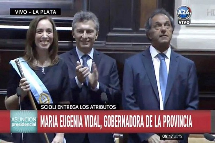 María Eugenia Vidal prestó este jueves juramento como gobernadora bonaerense, y recibió de Daniel Scioli la banda y el bastón de mando, ante la Asamblea Legislativa provincial, en un acto en el que estuvo presente el presidente electo Mauricio Macri.   La flamante mandataria juró al mando minutos después de las 9, junto a su vicegobernador Daniel Salvador. Vidal recibió por parte de Daniel Scioli los atributos de mando. Tras jurar, Vidal de inmediato se abrazó con Macri y luego también lo hizo con Scioli.En el estrado principal, la flamante gobernadora se acomodó al lado del presidente electo, de Scioli y del vicegobernador saliente, Gabriel Mariotto. También participó del acto el flamante jefe de gobierno porteño, Horacio Rodríguez Larreta."La política es servicio para mí", planteó Vidal durante su primer discurso y aseguró: "La provincia es de la gente y ustedes son nuestros jefes. Miren que nos pongamos en su lugar y que resolvamos en serio esos problemas que los angustian"."Voy a gobernar para todos", prometió la flamante gobernadora. "Les pido a los que no me votaron que dejen atrás los prejuicios, espero contar con ustedes", agregó.La flamante gobernadora  se comprometió a enfrentar "con responsabilidad y decisión" la inseguridad y reparar "la ausencia del Estado en muchos lugares", a pesar de que "recibimos una provincia quebrada, deficitaria, llena de deudas".Una de las prioridades en la gestión de Vidal será el pago, en tiempo y forma, del medio aguinaldo. Del entorno de la flamante gobernadora aseguraron que se trabaja contrarreloj para liquidar el aguinaldo para los 600 mil empleados de la administración pública provincial."No hay margen para más impuestos, pero tampoco para bajarlos La provincia recauda sólo para pagar salarios, y ni así alcanza. Vamos a tener un déficit superior a los $ 15.000 millones, con un agujero financiero de $ 10.000 millones en diciembre", advirtió Hernán Lacunza, futuro ministro de Economía bonaerense.Recién este viernes, a las 13, la gobernadora le tomará juramento a sus ministros y secretarios, en el Teatro Argentino de La Plata.Inicialmente había jurado como vicegobernador Daniel Salvador, muy aplaudido por militantes radicales y por el expresidente de su partido Ernesto Sanz, quien acompañó desde una de las gradas.En el acto, en la Legislatura bonaerense también se encontraban presentes el jefe de Gobierno porteño, Horacio Rodríguez Larreta, así como el vicegobernador electo, Daniel Salvador; el vicegobernador saliente, Gabriel Mariotto, y el vicejefe de Gobierno de la Ciudad, Diego Santilli.Fuente: Noticias Argentinas