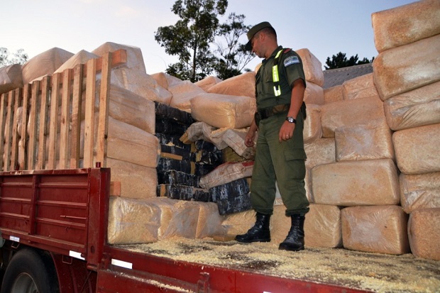 Gendarmería Nacional incautó 2.700 kilos de marihuana que eran trasladados ocultos en una carga de virutas de madera por un camión que circulaba desde Posadas con destino la Ciudad Autónoma de Buenos Aires. El procedimiento tuvo lugar en la madrugada de este miércoles en la localidad correntina de Gobernador Virasoro, donde efectivos del Escuadrón 57 “Santo Tomé” -mientras realizaban controles sobre la ruta nacional 14 a la altura del kilómetro 745- detuvieron la marcha de un camión con semirremolque conducido por un ciudadano de nacionalidad argentina, oriundo de Los Polvorines (Buenos Aires). Al solicitar la documentación pertinente, el chofer manifestó no poseer remito de la carga. Esto alertó a los gendarmes, que intensificaron la inspección. Al constatar fehacientemente lo transportado, notaron que, ocultos entre las bolsas de aserrín, había paquetes rectangulares similares a los utilizados para el transporte de estupefacientes. Con conocimiento del Juzgado Federal de Paso de los Libres, a cargo de Gladis Mabel Borda, el camión fue trasladado a la sede de la fuerza para una minuciosa requisa. Una vez en el lugar, se decomisó un total de 2.920 “ladrillos” que arrojaron un peso total de 2.700 kilos de marihuana. El magistrado que interviene en la causa dispuso detener al camionero, secuestrar la droga y demás elementos de interés para continuar con las pesquisas.
