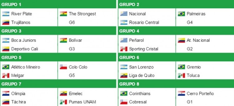 River Plate, vigente campeón de la Copa Libertadores, integrará el Grupo 1 de la edición 2016 junto a The Strongest de Bolivia, Trujillanos de Venezuela y un equipo procedente de la primera fase.Boca Juniors, por su parte, enfrentará a Bolivar de Bolivia, Deportivo Cali de Colombia y otro equipo de la primera etapa por el Grupo 3.San Lorenzo de Almagro, cabeza de serie del Grupo 6, tendrá una dificilísima instancia de clasificación en la que se medirá con Gremio de Portoalegre (Brasil), Liga de Quito (Ecuador) y Toluca de México. Y Rosario Central, en el Grupo 2, competirá con Nacional de Uruguay, Palmeiras de Brasil y otro equipo de la primera fase.En busca de ingresar a esta segunda fase, Racing enfrentará al Puebla de México, con definición en Avellaneda, mientras que Huracán jugará frente al Caracas, con el segundo partido en Venezuela.En caso de triunfo, la "Academia" jugará en el grupo 3 liderado por Boca, mientras que el "Globo" integraría la zona 4 con Peñarol, Atlético Nacional y Sporting Cristal. Según determinó el sorteo realizado en Luque, los otros cruces del repechaje serán Oriente Petrolero-Independiente Santa Fe; River (Uruguay)-Universidad de Chile; Independiente del Valle-Guaraní y César Vallejo-San Pablo. El ganador de esta última llave iría a la zona del "Millonario", mientras que en la de Rosario Central estará el vencedor de River de Uruguay-Universidad de Chile.