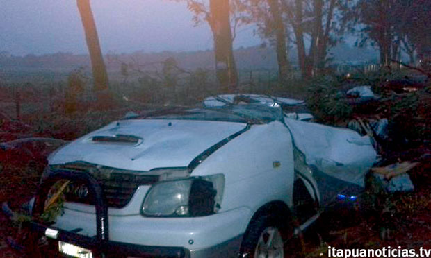 El fenómeno climático se inició alrededor de las 3 horas y duró unos 30 minutos dejando a su paso varias viviendas destechadas, árboles caídos y cortes de cables del tendido eléctrico. La localidad de Coronel Bogado fue una de las más afectadas sobre todo en el Barrio Santa Librada mientras que en la ciudad de Encarnación, el Barrio San Pedro, Etapa 8 fue el más perjudicado.Jorge García, intendente de General Artigas, reportó que un temporal de dos horas provocó el anegamiento de viviendas en el centro del distrito, perjudicando principalmente a familias humildes.Según el cálculo inicial, son unas 60 viviendas las afectadas, donde el agua ingresó dañando aparatos eléctricos y otros elementos. El intendente aguarda que un equipo de la Secretaría de Emergencia Nacional evalúe los daños.Además se informó que por primera vez el distrito de General Artigas sufrió el descborde de los arroyos Piririka y Yukyray, ubicados sobre la ruta 8, unos 20 kilómetros antes de la ruta 1. El jefe de la Comisaría 8va comentó que actualmente la ruta ya está despejada.Accidente fatalEl diario ABC Color informó que tres personas perdieron la vida mientras regresaban a Asunción desde la ciudad de 1° de Marzo, departamento de Cordillera, donde estuvieron trabajando en la animación de las fiestas que habitualmente se realizan allí en esta época del año. Las víctimas fatales fueron identificadas como Gabriel Santa Cruz Cañete Vera, más conocido como Gabriel Gabo, locutor y animador; su esposa, Elizabeth de Cañete; y su asistente, Luis Alberto Sosa Palma, conocido como “Pesoquita”.Cuando el vehículo en el que viajaban los tres alcanzó el kilómetro 48 de la ruta II “Mariscal Estigarribia”, un añoso eucalipto cayó sobre el rodado, informó la corresponsal de ABC Color Desiré Cabrera. En un primer momento, los intervinientes hablaron de cuatro personas atrapadas, una versión que ellos mismos se encargaron de desmentir tiempo después.Sin servicio eléctricoLa Ande informó que desde esta madrugada quedaron fuera de servicio un total de 41 alimentadores de 23.000 voltios, afectando así a 17 centros de distribución.Fuente: itapuanoticias.tv y abc.com.pyu000A