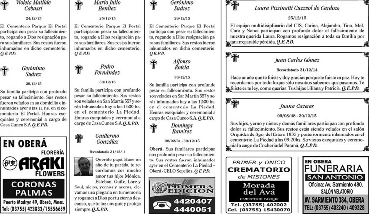 Fúnebres del sábado 2 de enero de 2016