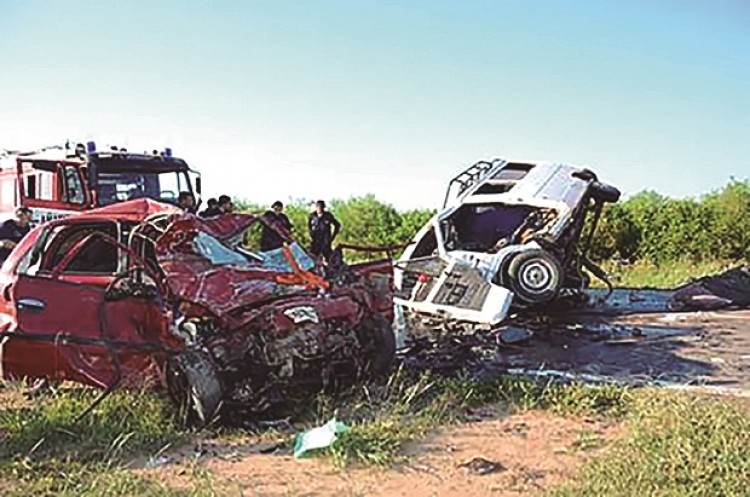 Seis personas murieron ayer mientras que otras diez resultaron con heridas al chocar un auto contra una combi en la ruta 34, a la altura de la localidad santiagueña de Herrera.Ocurrió a las 6:30 de la mañana, 80 kilómetros al sur de la capital santiagueña, cuando el coro del Centro de Actividades Juveniles de Salavina se dirigían a un festival folclórico.La Renault Traffic que transportaba a los adolescentes cantores, cuyas edades oscilan entre 13 y 16 años, chocó frontalmente con un Chevrolet Corsa en el que viajaban integrantes de una familia de Mar del Plata, que regresaba a la costa bonaerense tras pasar las fiestas en Tucumán. A consecuencia del impacto, fallecieron en forma instantánea dos ocupantes de la combi, Luciana Godoy (15) y María Esther Zaragoza (51), el conductor del auto, Sergio Reinoso, su acompañante, Débora Muñoz, y un niño. Horas más tarde falleció Aldana Martini (16), quien también integraba el grupo de menores del coro.