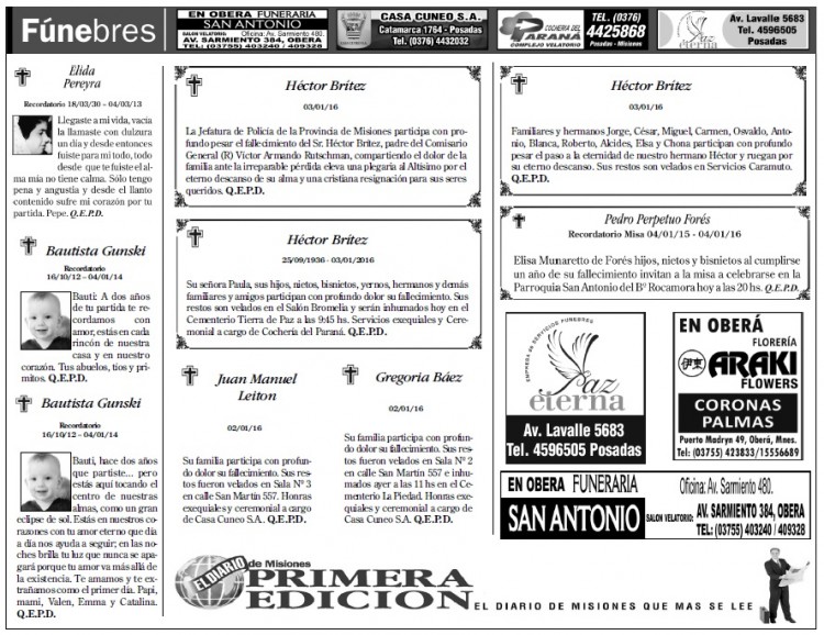 Fúnebres del lunes 4 de enero de 2016