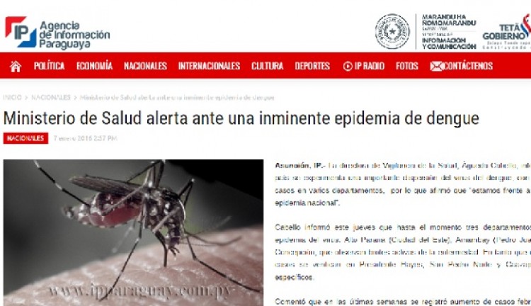 La directora de Vigilancia de la Salud, Águeda Cabello, informó que en el país se experimenta una importante dispersión del virus del dengue, con incremento de casos en varios departamentos, por lo que afirmó que “estamos frente a una inminente epidemia nacional”. Cabello informó este jueves que hasta el momento tres departamentos cuentan con epidemia del virus: Alto Paraná (Ciudad del Este), Amambay (Pedro Juan Caballero) y Concepción, que observan brotes activos de la enfermedad, en tanto que incrementos de casos se verifican en Presidente Hayes, San Pedro Norte y Caazapá, con brotes específicos.Comentó que en las últimas semanas se registró un aumento de casos febriles en el área metropolitana de Asunción y en la localidad de Yvaroty, en Guairá. Mencionó que se estarán reforzando las intervenciones en departamentos que presentan riesgo medio y alto, para impedir que puedan convertirse en zonas de brotes.La epidemióloga solicitó a la ciudadanía y a las diversas instituciones tomar conciencia del riesgo y colaborar en la lucha contra el Aedes aegypti.En 2015 se registraron 16.409 casos de dengue confirmados; 4.289 casos confirmados de chikungunya y se mantiene en 6 los casos de Zika, aunque continua la investigación de casos en otras zonas del país.Asimismo Cabello informó que recientemente se registró un nuevo caso de chikungunya en la ciudad de Lambaré, luego de diez semanas de corte de circulación. En tanto, en Luque se verificó un caso sospechoso que se encuentra actualmente en estudio.Fuente: Agencia de Información Paraguaya