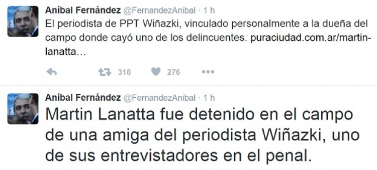 "Martín Lanatta fue detenido en el campo de una amiga del periodista Wiñazki, uno de sus entrevistadores en el penal", escribió el excandidato a gobernador bonaerense por el Frente para la Victoria, por lo cual pidió investigar los nexos del delincuente con la producción del programa periodístico de Canal Trece "Periodismo para Todos".Fernández atribuye su derrota a una campaña mediática en su contra que llevaron adelante distintas producciones periodísticas del Grupo Clarín, que lo vinculan con el Triple Crimen de General Rodríguez. Fernández agregó a través de su cuenta en la red social Twitter que "en la camioneta que volcó Lanatta, se hallaron 2 valijas con dinero" y se preguntó si acaso no contenían "el pago de PPT por la nota en el penal". En este sentido, concluyó que "a esta altura, los delincuentes tienen más vinculaciones con los periodistas Wiñazki y Lanata que las que les inventan" con él.Para el exfuncionario kirchnerista, "es imperativo investigar si valijas con dinero en la camioneta provienen de la producción de PPT", al tiempo que remarcó que "quien asistió económicamente a los criminales en su fuga es cómplice de narcotraficantes".En tanto, Fernández se hizo eco de un comunicado oficial de prensa firmado por los fiscales Jorge Di Lello y Diego Iglesias, en la cual atribuyeron la responsabilidad de haber notificado a la Justicia erróneamente la captura de los tres prófugos al Ministerio de Seguridad de la Nación. Sobre este tema, se preguntó: "¿Quién le mintió al Gobierno nacional? Peor aún, ¿cuán enorme debe ser la incapacidad para que difundan la mentira?". A raíz de la recaptura de Lanatta, Wiñazki se comunicó telefónicamente el sábado con la dueña del campo, Viviana Agusti, y se mostró asombrado al enterarse que el prófugo cayó dentro de la propiedad de su amiga."¿Vos me estás diciendo que donde los encontraron era un campo tuyo", le preguntó al aire en radio Mitre, a lo que la entrevistada contestó de forma afirmativa."En uno de nuestros campos, sobre la ruta 1", puntualizó Agusti, y precisó que "llegaron al puesto a pedir agua" y que "estaban hechos jirones, todos cortados". "Cuando vas campo traviesa tenés cortaderas, una planta que te corta. Además uno estaba mordido por un perro", relató. Fuente: Noticias Argentinas