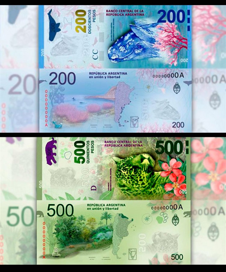 También se informó que habrá series nuevas de 20, 50 y 100 pesos, que comenzarán a circular en 2017. "La nueva familia de billetes convivirá durante un tiempo con los actuales circulantes", afirma el comunicado del BCRA."La incorporación de papel moneda de mayor denominación es una necesidad práctica para el mejor funcionamiento de cajeros automáticos y la reducción de costos de traslado de efectivo", agrega el comunicado.Para el diseño de los nuevos billetes se eligieron colores y animales. Atrás quedaron los próceres. Las ilustraciones serán de fauna autóctona argentina y diversas regiones del país. Cada uno de los billetes presentará en el anverso la figura de un animal típico de la región y en el reverso el hábitat característico de esa especie."El BCRA busca con esta familia de billetes resaltar la generosidad de la naturaleza hacia la Argentina y, al mismo tiempo, enfatizar la importancia de preservar y promover la biodiversidad", explica el BCRA.Cada billete llevará los siguientes motivos:Billete de $1.000: Hornero (ave nacional). Región Centro.Billete de $500: Yaguareté. Región Noreste.Billete de $200: Ballena franca austral. Mar Argentino, Antártida e islas del Atlántico sur.Billete de $100: Taruca, Región Noroeste.Billete de $50: Cóndor. Región Andina.Billete de $20: Guanaco. Estepa patagónica.Asimismo, se acuñará un nuevo cono monetario integrado por $ 1, $ 2, $ 5 y $10, cuya circulación se pondrá en marcha en 2017.Fuente: Agencias de Noticias y Medios Digitales