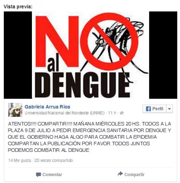 Ayer, el Ministerio de Salud Pública, en su parte epidemiológico confirmó que actualmente en Misiones son 862 los casos probables y se confirmado 35.Sin embargo la población entiende que estos números dejan lugar a sospechas y entiende que son muchos más los pacientes que padecen el virus provocado por el Aedes aegypti. (function(d, s, id) { var js, fjs = d.getElementsByTagName(s)[0]; if (d.getElementById(id)) return; js = d.createElement(s); js.id = id; js.src = "//connect.facebook.net/es_LA/sdk.js#xfbml=1&version=v2.3"; fjs.parentNode.insertBefore(js, fjs);}(document, ‘script’, ‘facebook-jssdk’));<p>ATENTOS!!!! COMPARTIR!!!! MAÑANA MIÉRCOLES 20 HS. TODOS A LA PLAZA 9 DE JULIO A PEDIR EMERGENCIA SANITARIA POR DENGUE Y…</p>Posted by <a href="https://www.facebook.com/GabrielaArruaRios">Gabriela Arrua Rios</a> on <a href="https://www.facebook.com/GabrielaArruaRios/posts/1146976598646909">martes, 19 de enero de 2016</a>