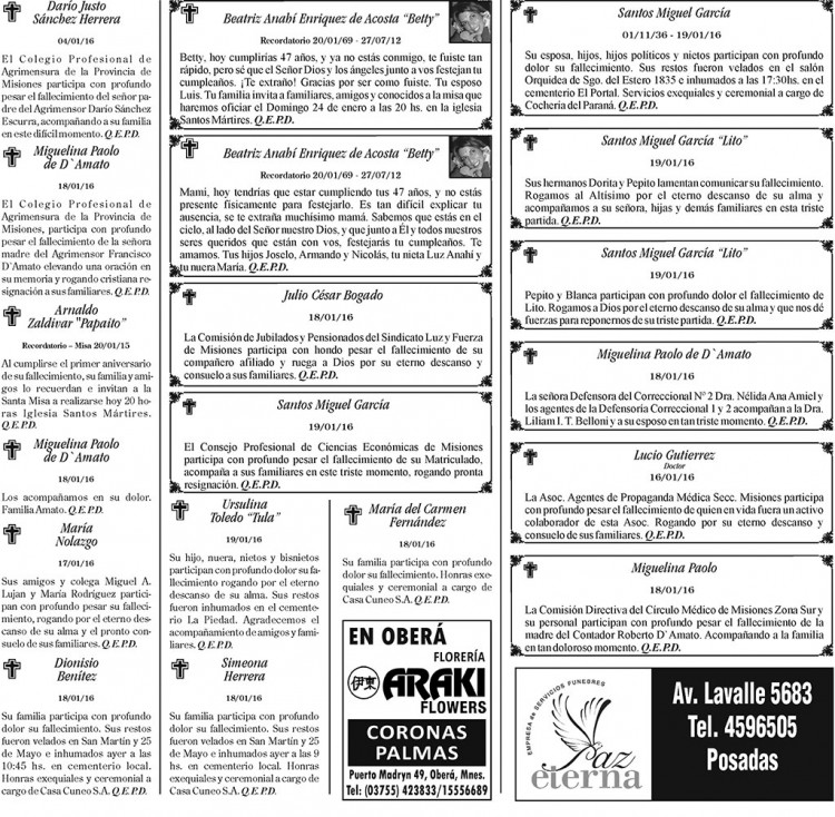 Fúnebres del miércoles 20 de enero de 2016