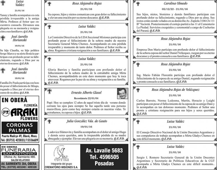 Fúnebres del viernes 22 de enero de 2016