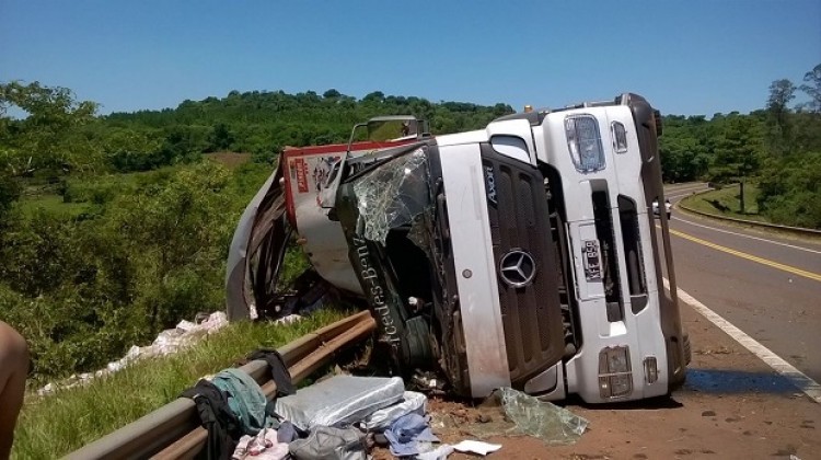 Un camión cargado con paquetes de yerba volcó durante la tarde de ayer sobre la ruta nacional 14 en jurisdicción de la localidad de Cerro Azul.De acuerdo a voceros policiales, el accidente se produjo a las 14.10 -por motivos no confirmados hasta el momento pero con sospechas relacionadas a un desperfecto mecánico- cuando el Mercedes Benz 1933, conducido por Sergio Omar Faulon de 38 años, domiciliado en provincia Buenos Aires y acompañado por Walter Calleri (40) (también con residencia bonaerense), se descontroló y volcó.Según las informaciones, los ocupantes del camión sufrieron lesiones leves, y sólo se lamentaron daños materiales y la pérdida de buena parte de la carga de yerba mate. Testigos refirieron que la contención metálica de la banquina evitó que el camión cayera al barranco. De no haberlo impedido las lesiones habrían sido mayores para el conductor y su acompañante.También señalaron que el vuelco no afectó a otros vehículos en un tramo de alta peligrosidad comprendido por curva en pendiente cuya velocidad máxima permitida es de 60 kilómetros por hora. Efectivos de la comisaría de Cerro Azul asistieron a los lesionados y realizaron las tareas para que el tránsito no fuera interrumpido.