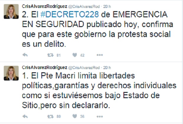 BUENOS AIRES (NA). La diputada nacional del FPV Cristina Álvarez Rodríguez afirmó este sábado que "el presidente Mauricio Macri limita libertades políticas, garantías y derechos individuales como si estuviésemos bajo Estado de Sitio, pero sin declararlo".En una serie de tuits, Álvarez Rodríguez expresó que el decreto 228 de emergencia en seguridad publicado en el Boletín Oficial "identifica en sus considerandos amenazas pero de manera imprecisa: delitos con fines políticos y otros, lo que confirma que para este Gobierno la protesta social es un delito".Agregó que el texto "no menciona el lavado de dinero y activos, primer vector de introducción del narcotráfico en la Argentina a través del sistema financiero" y dijo que "si no persigue el lavado, no es creíble que quiera combatir el narcotráfico, al que ayudó con la libre compra de hasta dos millones de dólares".Por último, la diputada señaló que "el decreto 228 de Macri otorga permiso de derribo, la aplicación de pena de muerte sin juicio previo, como bajo la dictadura cívico-militar".