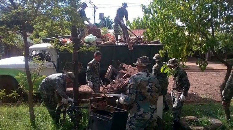 Efectivos de la fuerza, junto a operarios municipales, recorrieron distintos puntos de esta ciudad colaborando con las tareas de descacharrizado. El pedido de dicha colaboración se originó desde el Concejo Deliberante.Desde el cuerpo deliberativo remarcaron y agradecieron al Segundo Jefe del Regimiento de Rimte 30, Mayor Scasso Losa por la colaboración del Ejército en el objetivo de eliminar el almacenamiento de cacharros.Gustavo Carballo, director de Medio Ambiente de la Municipalidad, señaló que “comenzamos a trabajar en forma conjunta con el Ejército y queremos agradecer a los efectivos que están prestando esta colaboración en juntar todos aquellos materiales que pedimos a los vecinos que saquen a las veredas”, señalo el funcionario. Indicó que “continuamos con las fumigaciones en aquellos sectores que así lo requieran. Tenemos que destacar la colaboración de la población que está demostrando mucho interés en las tareas que estamos realizando y también buscando información para detener el avance de la enfermedad”.Agregó que “no tenemos un cronograma previsto porque trabajamos sobre casos puntuales en los cuales efectuamos las tareas requeridas, pero vamos a recorrer todos los barrios de la localidad”.