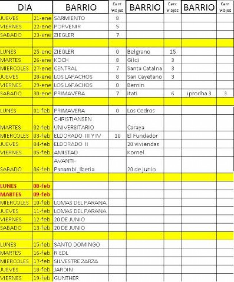 La Municipalidad de Eldorado informó que continúa la implementación del cronograma de descacharrización en la Campaña de la Lucha Contra el Dengue.En ese marco, difundió el nuevo cronograma de cumplimentación de eliminación de cacharros y chatarra.Se solicita a los habitantes de los barrios que figuran en él que, según su turno respectivo, acumulen los cacharros botellas y todo contenedor de agua en desuso en las veredas a fin de ser retiradas por el equipo.