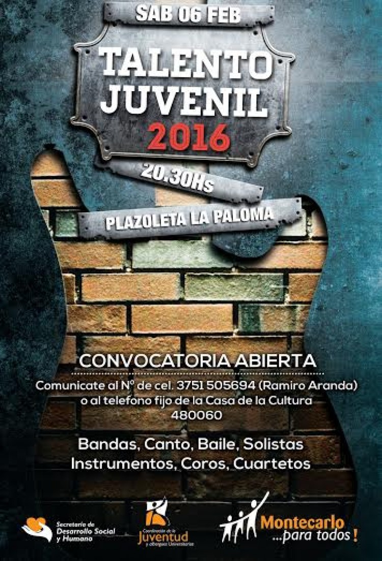 Organizado por la Coordinación de la Juventud y Albergues Municipales de la Comuna de Montecarlo, el próximo sábado 6 de febrero se llevará a cabo un gran festival con presentación de nuevos talentos juveniles locales. La convocatoria es abierta y está destinada a todos los jóvenes interesados de la ciudad."Si sos solista o tenés una banda, podés participar, sin importar el género musical. Podés estar presentando 2 o 3 temas, vas a ser parte de esta noche a pura música", convocó Ramiro Aranda, titular del área municipal a cargo del evento."Queremos hacer de esto un encuentro de amigos", agregó.El festival dará inicio a partir de las 19:00 en la plazoleta "La Paloma" y el cierre estará a cargo de la banda local Rebelión.