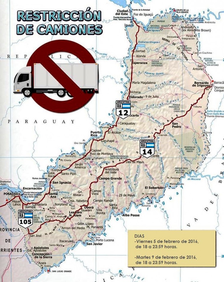 A fin de facilitar el desplazamiento vehicular y prevenir accidentes de tránsito en las rutas nacionales durante el próximo fin de semana largo de Carnaval, Desde la Dirección Nacional de Vialidad se informa que la circulación de camiones de más de 3.500 kgs. en las rutas de Misiones será restringida a los siguientes horarios: hoy, viernes 5 y el martes 9 de febrero de 18 a 23.59.En Misiones, la medida contempla la circulación sobre la ruta nacional 12 de Puerto Iguazú, al límite procincial con Corrientes en el arco de Posadas; la ruta nacional 14 desde Centinela (límite con Corrientes) hasta Bernardo de Irigoyen y la ruta nacional 105 desde Posadas hasta San José.Quedan exceptuados de la medida los transportes de leche cruda -sus productos derivados y envases asociados-, de animales vivos, de productos frutihortícolas en tránsito, exclusivos de prensa y unidades móviles de medios de comunicación audiovisuales, de atención de emergencias, de asistencia de vehículos averiados o accidentados, cisterna de traslado de combustibles, de gas natural comprimido y gas licuado de petróleo, de transporte de gases necesarios para el funcionamiento de centros sanitarios, de transporte de medicinas y de transporte a disposición final de residuos sólidos urbanos.