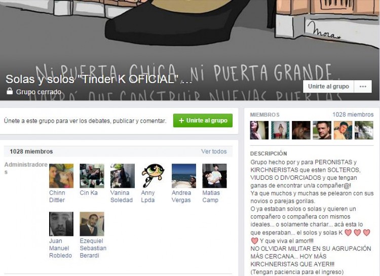 El grupo es cerrado y se ingresa con previa solicitud y está “hecho por y para peronistas y kirchneristas que estén solteros, viudos o divorciados y que tengan ganas de encontrar un compañero”.En la descripción del grupo se lee lo siguiente:Grupo hecho por y para PERONISTAS y KIRCHNERISTAS que esten SOLTEROS, VIUDOS O DIVORCIADOS y que tengan ganas de encontrar un/a compañer@!Ya que muchos y muchas se pelearon con sus novios o parejas gorilas.O ya estaban solos o solas y quieren un compañero o compañera con mismos ideales… o solamente charlar… acá esta lo que esperaban… el solos y solas K Emoticón heart Emoticón heart Emoticón heart Emoticón heart Y que viva el amor!!!NO OLVIDAR MILITAR EN SU AGRUPACIÓN MÁS CERCANA… HOY MÁS KIRCHNERISTAS QUE AYER!!!(Tengan paciencia para el ingreso)Fuente:NexoFin
