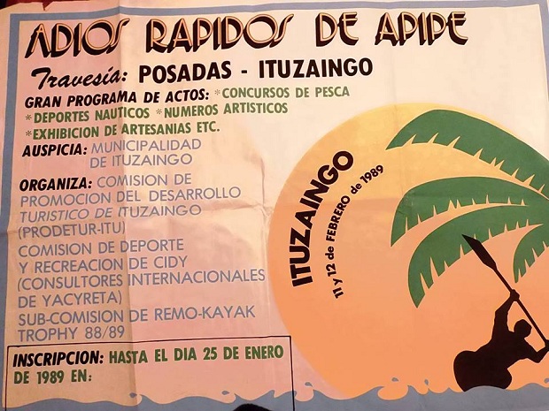 “Fue la despedida de uno de los lugares mas hermosos del río Paraná, hoy cubierto por la represa de Yacyreta: Los Rápidos de Apipé. Fue un desafío personal, para decirle adiós a ese lugar al cual cruzaba solo en mi kayak y sentir esa adrenalina, que solo esos momentos me daban, en pleno contacto con la fuerza de la naturaleza…”, escribió en su Facebook Atilio Cantalupi, rememorando aquella movida náutica que lo tuvo como principal impulsor.Cantalupi es reconocido por su trabajo en diferentes medios periodísticos, tanto radiales como televisivos. Es un apasionado por el turismo aventura, algo que empezó a descubrir desde muy chico y lo potenció cuando llegó junto a su familia a Ituzaingó (Corrientes), a los 13 años. “A mi viejo Norberto (ingeniero) le habían ofrecido ir a Salto Grande cuando era director de Fiat en Buenos Aires. Cuando se termina esa obra recibió la misma propuesta y así rumbeamos hacia Yacyretá. Fuimos la segunda familia en llegar a la Villa Permanente en Ituzaingó. Mi viejo era como el intendente en zona de obras”, rememora Cantalupi y apunta “yo llegué con 13 años, venía de la Escuela Industrial, en Buenos Aires. Cuando nos instalamos en Ituzaingó, todos los días venía a Posadas a estudiar a lo que hoy es la Epet porque allá había sólo Bachiller. Nos traía un colectivito y yo era el primero en subir y el último en bajarme”.Por entonces, Cantalupi ni imaginaba que lo atraparía tanto el rugir de los Rápidos de Apipé, al punto de organizar una actividad náutica que reunió a 345 embarcaciones y mil participantes, para despedir a ese tramo del río que sería devorado para siempre por la represa hidroeléctrica de Yacyretá.Siete kilómetros con el kayak al hombro“Cuando llegué a Ituzaingó la primera vez, miré al río con ganas. En la villa permanente no había otra actividad más que jugar al ping pong o al metegol. Después pude comprar un kayak que todavía lo tengo colgado y con esa embarcación me iba a recorrer el río. Mi viejo me dejaba en el lugar de Aduanas de ingreso a Yacyretá y yo caminaba unos siete km con el kayak al hombro para llegar al agua y tirarme en la zona de los Rápidos. La gente me miraba como diciendo: ‘Este está loco’, por lo que hacía. Recorría las islas, me fui a Corrientes capital remando sólo… después de Iguazú a corrientes Capital”, relata Cantalupi, cargado de emoción en cada frase. El evento de despedida de los Rápidos de Apipé se realizó el 11 y 12 de febrero de 1989, contó con las presencia de gente de todo el país que llegó con su canoa, bote de madera, lanchas, tablas de windsurf, veleros… nadie quiso perderse aquél acontecimiento histórico.Cuando se sabía que el llenado de la represa iba a “esconder” para siempre a ese sitio tan especial adónde iba a remar casi siempre, Cantalupi -afirma- sintió “un dolor bárbaro, hasta hoy a veces recuerdo con angustia y ganas de llorar porque uno los vio en su momento y sabíamos lo que eran. Duele porque perder un lugar así por el avance del progreso…”Todo a pulmónA los 19 años ya empezaba a sonar en la cabeza de Cantalupi el evento en honor a los Rápidos de Apipé. “En esa época no contábamos con las redes sociales, como facebook, para hacerlo, así que desde la empresa donde estaba con mi primer trabajo, CIDY Consultores Internacionales de Yacyretá y la Subcomisión de Deportes Nauticos y Recreación, empezamos a promocionar el evento y a comunicarnos con clubes náuticos y secretarias de turismo de todo el país. Mandábamos cartas, con el afiche bien dobladito adentro. También con los diarios de Misiones, Corrientes y de nivel nacional. Sumamos gente de excelencia, por cierto, para que ese mega evento se concretara”.Insuperable“Hasta ahora ningún evento náutico superó la convocatoria de esa vez. Llegada la fecha empezaron a llegar de todo el país. Hubo que construir la bajada de lancha y otras obras de infraestructura en Ituzaingó que dieron paso después al club”, explicó Cantalupi. Las mil personas y sus embarcaciones partieron el 11 de febrero desde las viejas instalaciones del Club Pyrá Pytá de Posadas. “En Garapé se hizo la primera parada, donde está Prefectura. Había otro grupo, a cargo de mi viejo y Tito Ilardo, que se encargaron de armar todo el campamento. Se mataron dos vacas para darle de comer a todos, la Eriday llevó un camión con bebidas, hielo y otros elementos. Fue un campamento monstruoso, con música para amenizar esos momentos. Allí pernoctamos”. Al día siguiente, muy temprano, Cantalupi les explicó a todos cuál sería el recorrido que harían, por donde avanzar para pasar los Rápidos, porque cuando más cerca de la costa lo hacían era más complicado. “Yo pasé con otro muchacho con los kayaks por el lugar más difícil. A medida que nos íbamos acercando al lugar, escuchando por última vez el ruido… fue una sensación muy fuerte. Toda la gente pasó y llegamos a Ituzaingó alrededor de las 12 con una tremenda emoción. Fue muy simbólico, para por mí por la ‘locura’ que cargaba en ese momento, pasar por un sitio que sabíamos se perdería y donde disfruté de una parte importante de mi vida”.