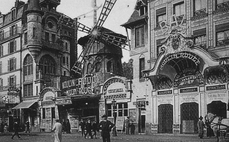 Posiblemente hace cientos de años ya hubo hombres y mujeres que se desnudaron frente a otras personas al ritmo de una música sugerente, pero el que está considerado como el primer striptease en una sala comercial frente a espectadores (del que se tiene constancia) tuvo lugar en el Moulin Rouge de París el 9 de febrero de 1893, cuatro años después de abrir sus puertas.Ese primer striptease o effeuillage (como se le llama en francés) corrió a cargo de una bailarina, recién contratada en el Moulin Rouge, llamada Mona y a la que el propietario del local, el barcelonés Josep Oller, encargó entretener a un grupo de jóvenes estudiantes que habían acudido al cabaret. Fue entonces cuando a la artista se le ocurrió realizar frente a los muchachos un baile en el que se iba quitando la ropa poco a poco, mientras simulaba que buscaba una pulga que le estaba picando por todo el cuerpo.Las autoridades parisinas impusieron una multa de 100 francos a la joven exhibicionista por realizar una acción impropia en un lugar público.Cabe destacar que en 1893 también se producía otro sonado striptease en este mismo local parisino, realizado por una modelo llamada Sarah Brown durante la fiesta de disfraces Bal des Quat’z’Arts y en la que iba vestida de Cleopatra. La policía se presentó en la fiesta, disolviéndola y multando a la artista, esto provocó que se organizase una importante manifestación de protesta en el barrio Latino de París.Un año más tarde los stripteases eran un número más que, junto al can-cán, se convirtieron en seña de identidad del Moulin Rouge.