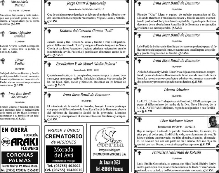 Fúnebres del miércoles 10 de febrero de 2016
