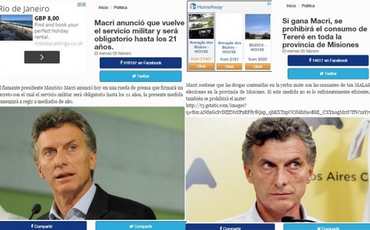 "Macri anunció que vuelve el servicio militar y será obligatorio hasta los 21 años". "El Superior Tribunal de Justicia de Misiones prohibirá tomar mate". Estos son algunos de los títulos elegidos por quienes se creen graciosos y aprovechan los sitios de noticias falsas para generar revuelos en la web. Lo peor del caso es que miles de personas comparten estas “bromas” en las redes sociales, dando por ciertas cosas que no son. Entre los sitios más populares estan “Noticias365.info” con uno similar en Facebook; “tus-noticias.info”; “socialnoticias.com”; y “unoticias.net”. Pero apenas son algunos casos donde algunos se divierten creando temas que están muy lejos de ser reales.Los creadores de los sitios ponen un instructivo para los que nunca vieron la estructura de una noticia, similar en muchos casos a los modelos que utilizan portales informativos en internet, bajo el título “¡Crea tu broma ahora! Crea tu noticia falsa y engaña a todos tus amigos. Puedes compartir la noticia en cualquier red social.” Incluso posibilita visualizar las mismas por secciones: política, internacional, nacional, entre otras. Para ilustrar la broma, se pueden agregar imágenes, donde muchos aprovechan para poner logos de medios reconocidos para darle un toque de “realismo” a sus inventos. La única advertencia que varias de esas páginas realiza es que “Se prohíbe cualquier chiste racistas, homofóbicos o pornográficos”. Incluso permite un formulario de contacto ante las quejas: “No dude en informar de cualquier contenido inapropiado”. El problema es que, al copiar el link, si no se conoce la página bromista, la “noticia” indica en letra muy pequeña y al final de la página que se trata de una falsedad. Muchos no leen ni llegan hasta el final y caen en la trampa.¿Es apropiado poner en boca de otra persona cosas que no dijo? ¿Es suficiente con la advertencia en el inicio del portal que se trata de una broma? ¿Roza lo ilegal cuando inventa hasta números de resoluciones? Mientras esto se discute, muchos seguidores de Facebook, Twitter e Internet en general, comparten y opinan como si las bromas fueran una realidad.Misiones, entre las noticias falsasBasta con poner algunos de títulos llamativos para crear además el apoyo de algunos y la bronca de otros tantos. El caso de la prohibición de la bebida insignia de Misiones en los Tribunales llegó a conmover a empleados judiciales que mediante Whatsapp advirtieron su enojo, ya que la falsa noticia mencionaba hasta un número de acordada (la 11/2016) supuestamente firmada por el titular del poder judicial provincial, Froilán Zarza. Al punto que algunos denominados sitios informativos locales reprodujeron la broma como trascendido, evidentemente sin chequear las fuentes, un trabajo rigurosamente obligatorio para cualquier medio de comunicación. Ocurre que muchos de estas páginas web se alimentan del “copia y pegue”.En el invento de la falsa noticia, el autor aún desconocido puso que la resolución del STJ se fundamentaba en que “le daba vergüenza tener que elevar expedientes a la Corte Suprema de Justicia de la Nación, con hojas manchadas con mate” y el incremento en el consumo de energía eléctrica de artefactos calentadores. Y que el mate hacía que el personal judicial fuera al baño en más ocasiones perdiendo tiempo laboral útil. Suficientes afirmaciones para entender la falsedad de la misma.Sin tereréOtra de las publicaciones, en noviembre pasado, anunciaba que si Macri ganaba la presidencia, prohibiría el tereré en Misiones. “El candidato a presidente por Cambiemos prohibiría el tereré en toda la provincia de Misiones en caso de ser electo presidente. Fuentes muy allegadas al candidato afirmaron el plan de eliminar la infusión, ya que la misma fomentaría la altos niveles de consumo de agua y yerba mate”, indicaba la falsa noticia. Si de yerba mate se trata, aparecieron títulos falsos como “Macri prohibirá la cosecha y venta de yerba mate, a partir de diciembre” y se advertía que a cambio daría permisos a una cadena de cafeterías muy conocida para instalarse en todo el país. Al contrario de las prohibiciones, un anónimo inventó que “Macri afirma que si gana las elecciones otorgara subsidios para la compra de yerba mate”. Y en plena época de campaña, alguien aseguró falsamente que “Macri anuncio que hará pistas de esquí en Misiones. Luego de prometer que Santiago del Estero tendrá puertos, el referente de Cambiemos redoblo la apuesta: ‘Tendremos nieve y las mejores pista de esquí en Posadas’”.