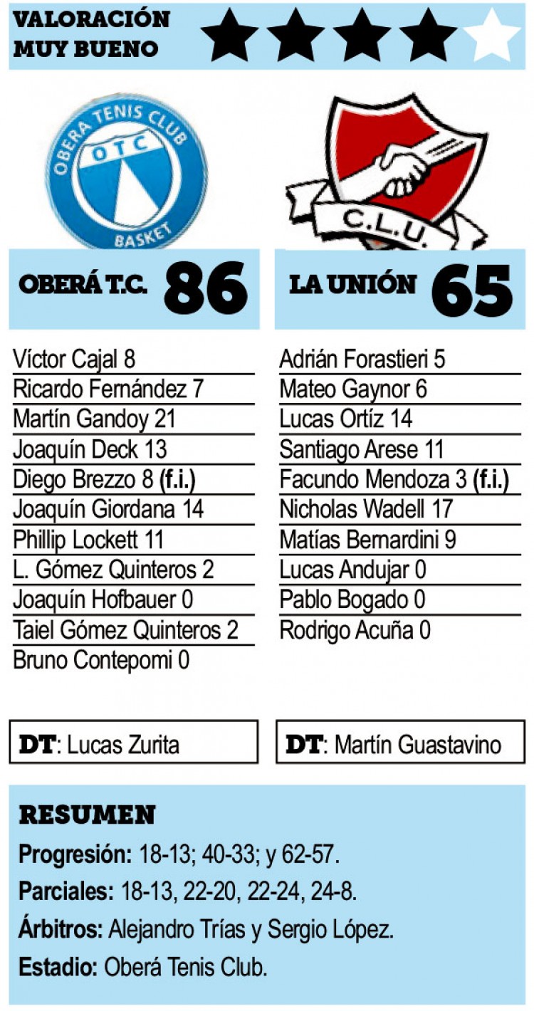 En este caso fue el turno de La Unión de Colón, a quien venció 86 a 65 con parciales de 18-13, 22-20, 22-24 y 24-8. Con una actuación colectiva sólida fue construyendo el triunfo progresivamente. El base Víctor Cajal volvió a tener una noche brillante al terminar muy cerca de la triple doble figura y se llevó el premio al jugador con mayor valoración gracias a las 13 asistencias, 10 rebotes y 8 puntos. El local jugó concentrado el primer tiempo, apoyado en una buena defensa que solo le permitió al rival 13 puntos. Adelante movió la bola y anotó con Deck, Fernández y Brezzo en la “pintura”. Luego, en los primeros momentos del segundo cuarto, con dos triples seguidos de Giordana estiró la diferencia a nueve puntos (26-17). “Tenis” respondió con buenas defensas y algunas imprecisiones en ataque. De todos modos, promediando el parcial se escapó a nueve puntos y con otro triple de Giordana trepó a diez y fue por más. La máxima ventaja llegó a ser 34-22.Sin embargo, volvieron aparecer algunos problemas ofensivos y en este caso no respondió de la misma manera atrás, entonces el rival descontó y terminó el parcial perdiendo por dos puntos (22-20). No obstante, el local fue superior el primer tiempo. Para colmo, Gandoy y Deck, dos de los hombres ofensivamente más activos de los últimos partidos, estaban apagados. Sin embargo, se reactivaron y reaccionaron con un triple y un contraataque para despegarse otra vez (53-46). A eso, el alero goleador le agregó un cierre con cinco puntos seguidos para coronar los 10 minutos 62 a 57. El cuarto nuevamente fue para OTC, que se llevó así el premio que todos esperaban.De esa manera, el “Tenis” se muestra totalmente recuperado de los altibajos anteriores y encarará la última parte de la fase con otro ánimo. Ahora llegarán otra vez tres cruces en la ruta: nuevamente La Unión, Echagüe y Unión de Santa Fe. Después vendrán otros cinco juegos en los que el único representante del básquetbol misionero en la segunda categoría intentará meterse entre los mejores.POSICIONES – CONF.?NORTEEQUIPO %PG PJVilla Ángela (Villa Ángela-Chaco) 77,8 27Hindú (Resistencia-Chaco) 74,1 27San?Isidro?(San Francisco-Cdba) 72,0 25Unión?(Santa Fe) 57,1 28Barrio Parque?(Córdoba) 51,9 27Oberá Tenis Club (Oberá) 50,0 28La Unión?(Colón-ER) 50,0 26Atlético Echagüe?(Paraná) 46,4 28Salta Basket (Salta) 38,5 26Uncaus?(Sáenz Peña-Chaco) 36,0 25Tiro Federal (Morteros-Cdba) 32,1 28Comunicaciones?(Mercedes-Ctes) 32,0 25Sarmiento?(Resistencia-Chaco) 26,9 26POSICIONES – CONF.?SUREQUIPO %PG PJPlatense (Buenos Aires) 69,2 26Rocamora ?(C.del Uruguay-ER) 60,0 25Hispano?Americano (R. Gallegos) 59,3 27Dep.Alianza (Viedma-Río Negro) 55,6 27Estudiantes (Olavarría) 53,8 26Olimpo (Bahía Blanca-Bs As) 53,8 26Parque Sur?(C.del Uruguay-ER) 52,0 25Ciclista?(Junín-Buenos?Aires) 50,0 28Gimnasia?y Esgrima?(La Plata) 46,2 26Huracán (Trelew-Chubut) 42,3 26Atenas (C. de Patagones-BsAs) 42,3 26Monte Hermoso (Bs As) 37,0 27Petrolero Argentino (Neuquén) 32,0 25