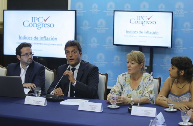 La inflación de enero fue del 3,6%, con las principales subas en alimentos y bebidas, y anualizada arrojó un 29,9%, según el indicador difundido por la oposición en el Congreso.En el trimestre noviembre-enero, la inflación acumulada trepó a 9,6%, y en este caso el rubro Alimentos y Bebidas creció 13%.Según los legisladores que hicieron la presentación, en noviembre la inflación fue del 2,2%; en diciembre subió al 3,8% y en enero al 3,6%.En la conferencia de prensa, el diputado del Frente Renovador Sergio Massa aseguró que "la inflación es una enorme fábrica de pobreza, una enfermedad de la economía que destruye salarios e ingresos", y agregó que "desgraciadamente la Argentina viene colocada en los primeros lugares del mundo" en suba de precios. Massa informó que los legisladores de la oposición difundirán el indicador elaborado por consultoras entre el 5 y el 10 de cada mes."Pedimos al Gobierno nacional que haga el esfuerzo de acelerar para que lo antes posible tengamos un Indice de Precios al Consumidor" del INDEC, sostuvo Y agregó: "estamos dispuestos a colaborar en la reorganización que necesita el organismo producto de la enorme manipulación y persecución" que hubo en la anterior gestión.Marco Lavagna, diputado del FR, sostuvo que la difusión del índice "no tiene una intencionalidad política" y sostuvo que "reconocer el problema es el puntapié inicial para afrontarlo".Advirtió que "va a llevar un tiempo reconstruir el INDEC, por eso seguimos con el índice Congreso".A su turno, la diputada del GEN, Margarita Stolbizer, dijo que el país "necesita estadísticas confiables" y señaló que "no puede demorarse en que nos hagamos cargo de los datos reales de la inflación"."La inflación altísima registra en los últimos meses en los productos de la canasta básica de alimentos", afirmó la legisladora .Por su parte Victoria Donda, diputada de Libres del Sur, aseveró que "la sociedad necesita un índice de referencia, sobre todo en un momento de paritarias"."Es importante que el Congreso siga difundiendo este índice y como crear un sistema estadístico confiable, que de credibilidad en las instituciones", sostuvo. Fuente NA