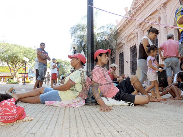 Los peones rurales de Oberá extremaron la protesta ante la falta de respuestas del Gobierno provincial. El miércoles cortaron el puente internacional, ayer bloquearon las calles céntricas de la ciudad de Posadas y hoy decidieron continuar sus medidas de fuerza encadenándose frente a la Gobernación, en la Plaza 9 de Julio.Solicitan asistencia alimentaria y de útiles escolares para todas las familias de cuatro agrupaciones de la Zona Centro. Amenazan con seguir extremando las medidas de lucha si no atienden sus necesidades básicas. Anticiparon que llegarán nuevos grupos de tareferos para fortalecer y continuar la protesta.Los trabajadores rurales se encuentran en la capital desde el pasado lunes, cuando se reunieron con autoridades provinciales, pero no obtuvieron respuestas. Ahora quieren que el Inym o el gobierno provincial los asista con ayuda alimentaria y kits escolares. Por el momento no tuvieron respuestas.