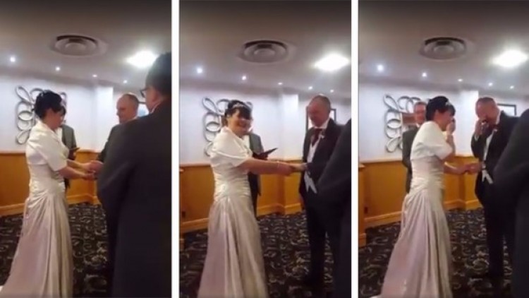 La pareja, de Escocia, estaba teniendo una ceremonia religiosa cuando el encargado de la ceremonia pidió dar lectura de sus votos. "Me comprometo a desafiarte cuando sea apropiado", leyó Andy y pidió a Stephanie que repitiera la oración. Pero antes de que pudiera pronunciar las palabras, Stephanie comenzó a tener un ataque risa. Su marido, de 54 años, se muestra un poco avergonzado pero no esconde una tímida sonrisa. "Había una palabra que mi marido no puede decir. Él no puede pronunciar ’apropiadamente’ de manera correcta. Yo no podía dejar de reír", explicó Stephanie a The Mirror. Pero a pesar de ligero inconveniente, el resto del día transcurrió sin contratiempos. "Un invitado dijo que mi risa era contagiosa. No podía parar. Así ese cómo soy. Ya lo he hecho antes en restaurantes y siempre se me quedan mirando”, contó. (function(d, s, id) { var js, fjs = d.getElementsByTagName(s)[0]; if (d.getElementById(id)) return; js = d.createElement(s); js.id = id; js.src = "//connect.facebook.net/es_LA/sdk.js#xfbml=1&version=v2.3"; fjs.parentNode.insertBefore(js, fjs);}(document, ’script’, ’facebook-jssdk’));<a href="https://www.facebook.com/Tmahn20/videos/1162135403811229/"></a><p>Canny take her anywhere ???????????? skip to 1.04 if u wanna see what I'm talking about ????????????</p>Posted by <a href="#" role="button">Tony Cheesman</a> on lunes, 15 de febrero de 2016Fuente:A3