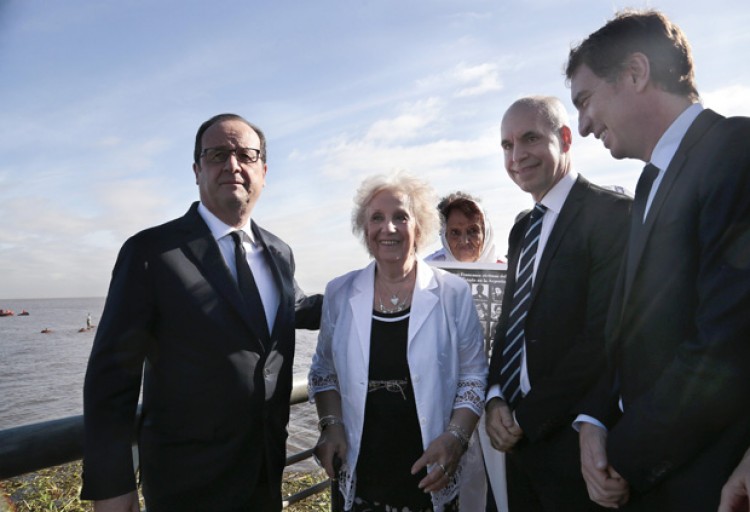 El presidente de Francia, François Hollande, concluyó hoy su visita a la Argentina con un homenaje a detenidos-desaparecidos de la última dictadura militar junto a Abuelas de Plaza de Mayo, así como también recibió un tour personalizado en La Bombonera por parte del mandatario Mauricio Macri."Siento una gran emoción. Quiero expresar la solidaridad de Francia para con las víctimas de la dictadura, víctimas de la opresión, víctimas de la barbarie. Y saludar la lucha de estos hombres, de estas mujeres que han buscado durante tantos años a sus hijos, a veces a sus nietos y que solo lo han logrado después de haber llevado tantos trámites", afirmó el jefe de Estado galo.Al mismo tiempo, destacó la tarea de "estas mujeres, estos hombres que todavía están aquí hoy porque la barbarie nunca acaba"."En otras partes del mundo hoy en día hay mujeres, niños, hombres que son asesinados por sus ideas", subrayó. Más tarde, Hollande recorrió las instalaciones del Estadio Alberto J. Armando con Macri como guía, con quien intercambio camisetas: el francés se llevó las casacas del Xeneize y la Selección Argentina con la número diez en la espalda y le entregó al jefe de la Casa Rosada la azul de Francia."Parece ser un fanático del fútbol, del deporte", señaló el líder del PRO en declaraciones a la prensa, antes de partir hacia Roma para encontrarse el próximo sábado con el Papa Francisco. En la Bombonera, Hollande se dio el lujo de patear un penal contra el arco que da a Casa Amarilla, ante la presencia del francoargentino campeón del mundo en 1998, David Trezeguet; y el secretario de Deportes de la Nación, Carlos Mac Allister.Luego, el presidente galo se trasladó a un encuentro con personalidades del mundo cultural argentino y francés, previo a un almuerzo con dirigentes de empresas de ambos países. Antes de partir rumbo a Uruguay encabezó una recepción de la comunidad francesa en el Liceo Jean Mermoz. Fuente: Agencia de Noticias NA