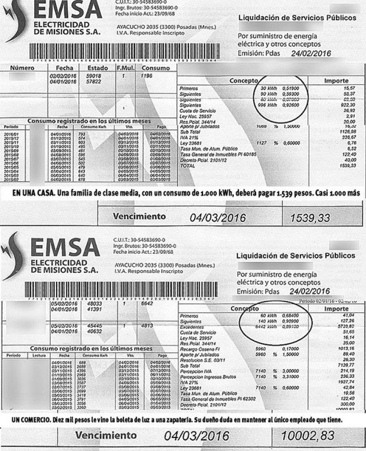 A los directivos de la empresa Electricidad de Misiones SA (Emsa) no les bastó con aplicar sin anestesia un aumento directo a los usuarios que va desde el 100% al 280%. Este viernes, con la llegada de las facturas a los domicilios, comercios e industrias de Posadas también quedó develado que ese incremento -impagable para muchos- no debió aplicarse todavía, puesto que las boletas dicen corresponderse con el período 02/2016 pero reflejan el consumo real registrado por cada usuario en enero de este año, período en el que Emsa compró energía “barata” en el Mercado Mayorista Eléctrico porque estaban plenamente vigentes los subsidios nacionales. La maniobra le permitirá a la ineficiente prestataria hacerse de un millonario “colchón” de entre 50 y 60 millones de pesos que no debieron ingresar a sus arcas hasta dentro de treinta días, una recaudación “extra” tres veces más grande que la de los meses anteriores, que sin embargo no será utilizada para pagar la energía al por mayor según los nuevos valores que rigen por imperio de la Resolución 06/16 de la Secretaría de Energía de la Nación.En otras palabras, la energía que llegó a Misiones en enero y se consumió en las casas, comercios e industrias de nuestra provincia, fue pagada por Emsa a precios subsidiados, pero Emsa decidió cobrarle a los usuarios con precios “sin subsidio”, una “avivada” que le dejará un margen enorme de ganancias. Los subsidios nacionales quedaron sin efecto a partir de la Resolución antedicha que en su artículo 1º señala claramente que se aprueba “la reprogramación trimestral de verano para el Mercado Mayorista Eléctrico… correspondiente al período comprendido entre el 1° de febrero de 2016 y el 30 de abril de 2016”.Zarpazo al bolsilloTal lo anticipado por PRIMERA EDICIÓN, el jueves comenzó el reparto de las boletas de período 02/2016 (que reflejan lo consumido desde el 4 de enero y hasta el 2 de febrero, momento del registro de los medidores) en la zona 01 de Posadas, comprendida por el microcentro y zonas cercanas al casco céntrico.Facturas de mil, dos mil y hasta diez mil pesos temblaban en las manos de los usuarios que recién viéndolas tuvieron una real dimensión del impacto de los anuncios que realizó el presidente de Emsa, Sergio Ferreira, hace tres semanas. En una conferencia de prensa, el funcionario justificó el “tarifazo” aduciendo que la empresa compraba el Megavatio/hora a un costo de 75 pesos y que en febrero pasó a costar 360, aumento que significaba la caída de los subsidios nacionales y que iba a impactar en los usuarios en forma retroactiva.?Lo que no dijo es que durante un mes completo, Emsa se iría a alzar con tantos millones de más por comprar barato y vender caro. Usuarios desconsoladosPamela es usuaria de la categoría “residencial” que en noviembre pagó 350 y el viernes recibió la boleta por un monto total de 1.029 pesos, con apenas unos kilovatioshora (kWh) más de consumo. En los casos de usuarios residenciales con consumos promedio de 1000 kWh (familia de clase media con dos aires acondicionados, heladera y freezer) Emsa les facturó los primeros 30 kWh a $ 0,51900; los siguientes 90 a $0,59300; los siguientes 80 a $ 0,87000 y el excedente a 0.92600. Es el caso de un empleado que tiene su vivienda en el barrio Judicial y deberá pagar un total de 1.539,33 pesos antes del 4 de marzo. Extrañamente, una usuaria del centro de Posadas que consumió 1.470 Kwh entre el 4 de enero y el 2 de febrero de este año, deberá pagar 2.014,67 pesos mientras que la facturación de los kilowats consumidos es totalmente diferente a la del caso anterior. A ella le cobraron 0,63600 los primeros 30 kWh, 0,71200 los siguientes 90; 0,9990 los 80 siguientes y el excedente a un precio de 1,05900. Para los usuarios comerciales de la categoría 2 el golpe fue tremendo. El propietario de una zapatería céntrica que pagaba menos de cuatro mil pesos en los meses inmediatos anteriores, el viernes recibió la boleta por un monto de 10.002 pesos, el equivalente a lo que percibe de sueldo un empleado cuya continuidad laboral ahora está en dudas. No fue el único comerciante con esta “sorpresa” en las manos. De hecho la bronca era tal en el microcentro, que algunos mercantiles barajaban la posibilidad de una movida conjunta con la Cámara de Comercio de Posadas para que se refacturen las boletas emitidas y se respete el período en el que la energía todavía era subsidiada. Seguimos pagando más caro En la edición del jueves del diario La Nación, una nota dio cuenta de la “indignación” de los usuarios de la empresa Edenor por el impacto de los aumentos de la energía. Según el informe periodístico, las primeras facturas con los nuevos valores efectivamente reflejaron parte del consumo de febrero, por lo que “el tarifazo todavía no impactó de lleno, sino solo por esos días”. Amén de demostrar que la firma porteña no engañó a sus usuarios cobrándoles con aumento el consumo de enero, la nota da cuenta de los “irrisorios” montos que siguen pagando los usuarios porteños en comparación con los misioneros.“Un usuario de Villa Urquiza cuyo consumo fue de 315 kWh en el bimestre enero-febrero, abonó $101,34 en su última boleta de luz de Edenor. Al hacer la comparación con la factura eléctrica anterior, la suba es del 325%. El mismo usuario abonó a fines de diciembre $31,15 por un consumo de 240 kWh”, señala el informe, y cuenta que “otro usuario de Villa Urquiza, que aumentó considerablemente su consumo, debió afrontar un pago de $380 en su última boleta, valor muy superior a los $40 que venía pagando en promedio. La demanda eléctrica en su caso fue de 950 kW”. Por un consumo similar en la categoría residencial, un usuario de Posadas deberá pagar un promedio de 1.500 pesos con la nueva facturación de Emsa, que al costo le suma la “cuota de servicio”, el aporte por la Ley Nacional 25.957 (Fondo Nac