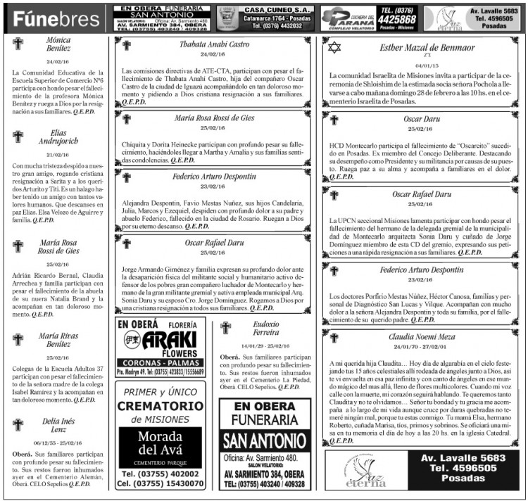 Fúnebres del sábado 27 de febrero de 2016