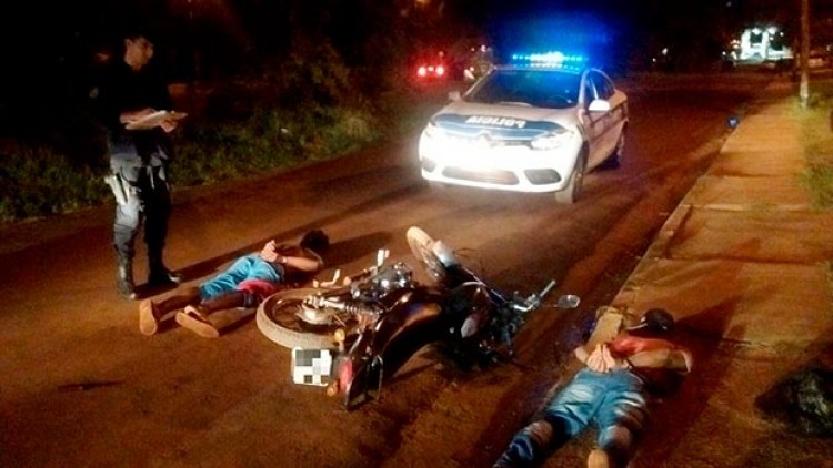 El hecho delictivo sucedió en la exruta 213 de Posadas, cuando una mujer de 29 años fue abordada por dos individuos en una moto, uno de los cuales la amenazó con un chichillo y la tomó del cuello, para sustraerle bolsas con mercaderías y 40 pesos, según lo declarado por la víctima en su denuncia.De inmediato los efectivos de la seccional 18ª, receptora de la denuncia, montaron un operativo de búsqueda de los sospechosos y pasadas las 20 horas, en calle Los Lapachos y avenida Alicia Moreau de Justo interceptaron una moto en la cual se trasladaban los dos sospechosos, quienes tenían en su poder un cuchillo, una mochila y dinero en efectivo.