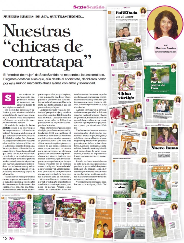 Son mujeres importantes sin proponérselo. Muchas ni siquiera se imaginaron dignas de una página en un diario. Son decididas, amorosas y valientes, y pese a tantas cualidades acumuladas, la mayoría es anónima o al menos lo fue hasta que las reflejamos con admiración y respeto desde este espacio. El modelo de mujer de SextoSentido escapa a los estereotipos. No es que nuestras “chicas de contratapa” hayan nacido heroínas ni que carezcan de dolores, miedos, debilidades, dudas. Por el contrario, al igual que el resto de nosotras, ellas también lidiaron y lidian con el lado menos amable de cada una. No son perfectas ni inmutables, no son de hierro. Sin embargo, al igual que otras tantas por casualidad, consciente o inconscientemente, han optado por un camino que tiene un denominador común: dejan huellas, marcan a las almas que las rodean con un halo de amor y solidaridad que las hace únicas, irremplazables, entrañables y dignas de admiración. Podrán ser todo esto para varios cientos o apenas para un minúsculo puñado de personas y personitas de su entorno, es lo de menos. Sea cual fuere el espectro que transforman con su existencia, este espacio es para ellas porque inspiran, y esa inspiración puede ser el empujoncito que necesitan otras tantas para dar el paso aquel hacia la meta que tanto anhelan y que les parece siempre lejana. Algunas fueron la “chica de contratapa” porque trabajan y estudian pese a los contextos difíciles que les toca enfrentar. Las hay que incluso recorrieron miles de kilómetros para escribir las páginas de sus respectivas historias.Otras estuvieron porque son parte de algún grupo humano (asociación, fundación, ONG, sea cual fuere el nombre de ese núcleo de corazones que integra) que ayuda a sus pares, se preocupa por el otro, mira más allá de sus narices y tiene plena conciencia de que nadie se salva solo; otras porque marcaron un camino para sus sucesoras, les abrieron puertas que antes estaban prohibidas para el género, tuvieron que marcar el terreno y ganarse un espacio que después ocupan las que vienen y vendrán con un contexto menos hostil y más “acostumbrado” a la presencia y el aporte femeninos, pero que no siempre tienen plena consciencia de lo duro que fue el tránsito para las “primeras”. Otras nos llamaron la atención por haber sido parte importante de una historia común que marca y explica el porqué “somos como somos” en la actualidad. Ellas nos revelan con su derrotero aquello que fuimos, de qué manera nos fuimos transformando y lo mucho que incorporamos como herencia atávica, a veces orgullosamente, otras sin saberlo. Algunas enfrentaron la adversidad con una capacidad infinita de soportar las frustraciones y hasta de perdonar, transformándose en un modelo de resiliencia que puede servir de ayuda para las que pasaron o pasan por situaciones difíciles. También estuvieron en nuestra contratapa las idealistas, las que hacen al mundo mejor, más justo y más lindo porque ellas decidieron mejorarse primero como personas para después influir sobre el entorno. Las hubo ecologistas, naturalistas, buscadoras de espiritualidad, proveedoras de salud y conciencia, dadoras de experiencias transgresoras y expertas en romper moldes. Pero lo verdaderamente bueno de esta meta que nos propusimos gracias a la generosidad de quienes sostienen este espacio, es que hoy estamos plenamente convencidas de que hay miles y miles de mujeres más que son merecedoras del mismo reconocimiento. Vos seguramente sos una de ellas. Por eso, no te achiques y ¡Feliz Día!
