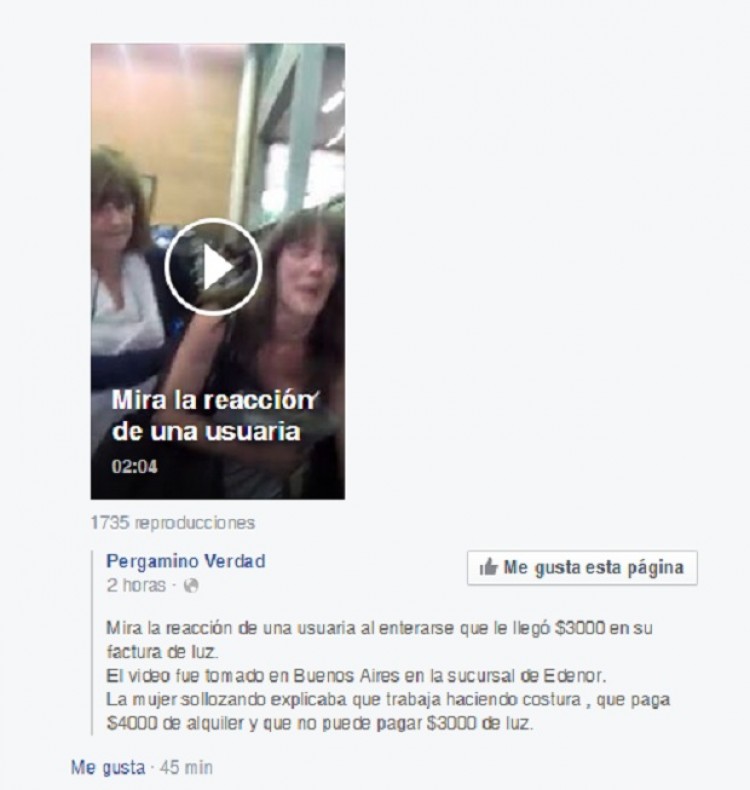 En el marco del incremento de las tarifas de luz pautado por el Gobierno nacional que ya comenzó a aplicarse en todo el país, en las últimas horas ha generado expresiones de rechazo en las redes sociales el video de una mujer que aparece presa de una crisis nerviosa luego de enterarse de que el monto a pagar en su caso ascendió a 3 mil pesos.El crítico momento fue registrado por Abel Aguirre, el propio esposo de la afectada, cuyo nombre sería Mirta, en las instalaciones en esta ciudad de Edenor, en donde debió ser asistida por policías y empleados del lugar, quienes le brindaron auxilio ante el brote de llanto por la imposibilidad declarada de no poder hacer frente a tamaña cifra."Así quedó mi mujer luego de enterarse de que tiene que pagar tres mil pesos de luz", repite varias veces el hombre, señalando el silencio cómplice de los encargados del lugar, sólo roto por la voz entrecortada que declaraba "no voy a poder", y apuntando contra Macri por generar tales situaciones de conflicto social.El video ha producido conmoción entre usuarios de Facebook, muchos de los cuales aportan su propio testimonio acerca de los desproporcionados montos que se agregaron a las boletas, luego de que el gobierno de Mauricio Macri decidiera eliminar los subsidios establecidos por las anteriores gestiones.(function(d, s, id) { var js, fjs = d.getElementsByTagName(s)[0]; if (d.getElementById(id)) return; js = d.createElement(s); js.id = id; js.src = "//connect.facebook.net/es_LA/sdk.js#xfbml=1&version=v2.3"; fjs.parentNode.insertBefore(js, fjs);}(document, ‘script’, ‘facebook-jssdk’));<a href="https://web.facebook.com/pergaminoverdad.periodismoindependiente/videos/1031275100267306/">Mira la reacción de una usuaria al recibir la boleta de luz.</a><p>Mira la reacción de una usuaria al enterarse que le llegó $3000 en su factura de luz.El video fue tomado en Buenos Aires en la sucursal de Edenor.La mujer sollozando explicaba que trabaja haciendo costura , que paga $4000 de alquiler y que no puede pagar $3000 de luz.</p>Posted by <a href="https://web.facebook.com/pergaminoverdad.periodismoindependiente/">Pergamino Verdad</a> on jueves, 10 de marzo de 2016En su muro de Facebook, Aguirre se encargó de aclarar que "la indignación de Mirta no sólo es con Macri sino también con los empleados de Edenor que nos querían convencer de que eso estaba bien, que no era un abuso, estaba mal la factura porque había también un error de categorización. Fue por eso que me peleé con los empleados y gerentes para que entendieran el error y que si no hacíamos nada también les va a afectar a ellos. Ahí fue donde se dieron cuenta y me dieron la razón y las gracias por defenderlos". Sin embargo, el hombre instó a los demás usuarios a reclamar por las subas: "Protestemos porque este señor nos lleva puestos a todos", finalizó su posteo. Fuente: Medios Digitales