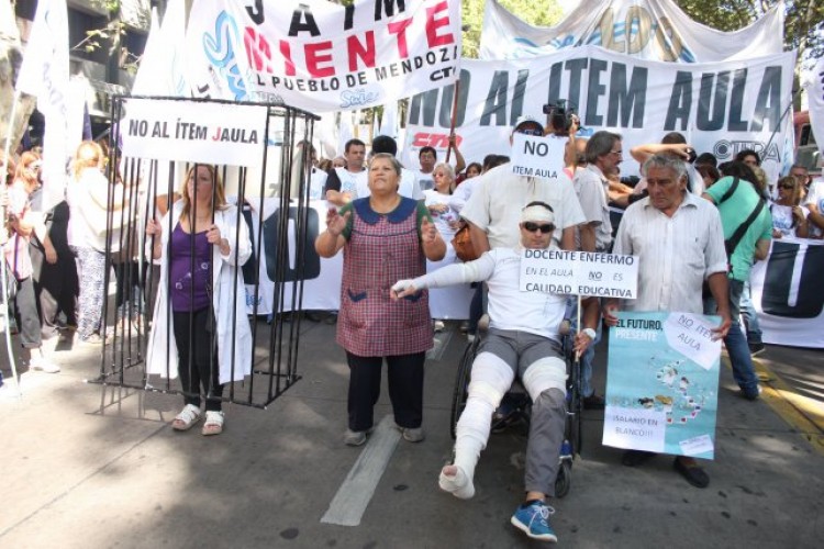 Los docentes de Mendoza anunciaron que realizarán nuevas huelgas si el Gobierno provincial no mejora la propuesta "engañosa" de un 32% de aumento salarial para 2016, tras haber realizado ya dos paros.El Sindicato Único de Trabajadores de la Educación (SUTE) dijo este viernes que el paro del jueves tuvo un acatamiento del 82%, pero el gobierno de Alfredo Cornejo intentó quitarle impacto a la medida y señaló que sólo el 35% de los docentes se sumaron.Los docentes y celadores de las escuelas públicas mendocinas se concentraron frente a la Legislatura provincial y se movilizaron hasta Casa de Gobierno para reclamar una oferta salarial mejor que la acercada hasta el momento.Fue segunda medida de fuerza de este tipo que aplica el gremio docente desde que comenzaron las clases y desde el sindicato adelantaron que si el aumento sale por decreto, las medidas de fuerza continuarán, publicó Diario Uno.La administración Cornejo no descarta un aumento por decreto dado que las negociaciones -por las que ya hubo seis reuniones formales- están trabadas en torno al ítem "aula" del recibo de sueldo docente.     Las reuniones que se llevaron a cabo en la Subsecretaría de Trabajo modificaron ese ítem que ahora contempla por ejemplo hasta tres inasistencias por mes, pero desde el gremio lo consideran "extorsivo" y remarcan que es remunerativo y no bonificable.Así, ese 10% de aumento que supone el ítem aula no va al básico y, por tanto, no repercute en otros factores claves como son la antigüedad y la zona, lo que presiona el salario hacia la baja.La Comisión de Educación de la Legislatura se involucró en el conflicto y pedirá al gobernador que no avance con el supuesto decreto y citarán al director general de Escuelas, Jaime Correas, con el fin de conocer la propuesta y tratar de colaborar para llegar al acuerdo.   El Sindicato Unido de Trabajadores de la Educación, rechazó la última propuesta del 32% de aumento y tras el paro del jueves anunció que podría impulsar nuevas huelgas con adhesión del gremio de los docentes privados, SADOP, y también los profesores secundarios nucleados en la Unión de Docentes Argentinos (UDA).   "No podemos aceptar esta propuesta engañosa, porque el 32% es sólo para el que recién se inicia. Ya que al no ser bonificable no repercute ni en la antigüedad, ni en la zona", dijo Adrián Mateluna, secretario general del SUTE.Entonces -señaló- para un docente que tiene 10 años en el sistema el aumento es del 25% y para el que lleva 24 años, sólo del 18%, por lo que es "inaceptable" esa discriminación.