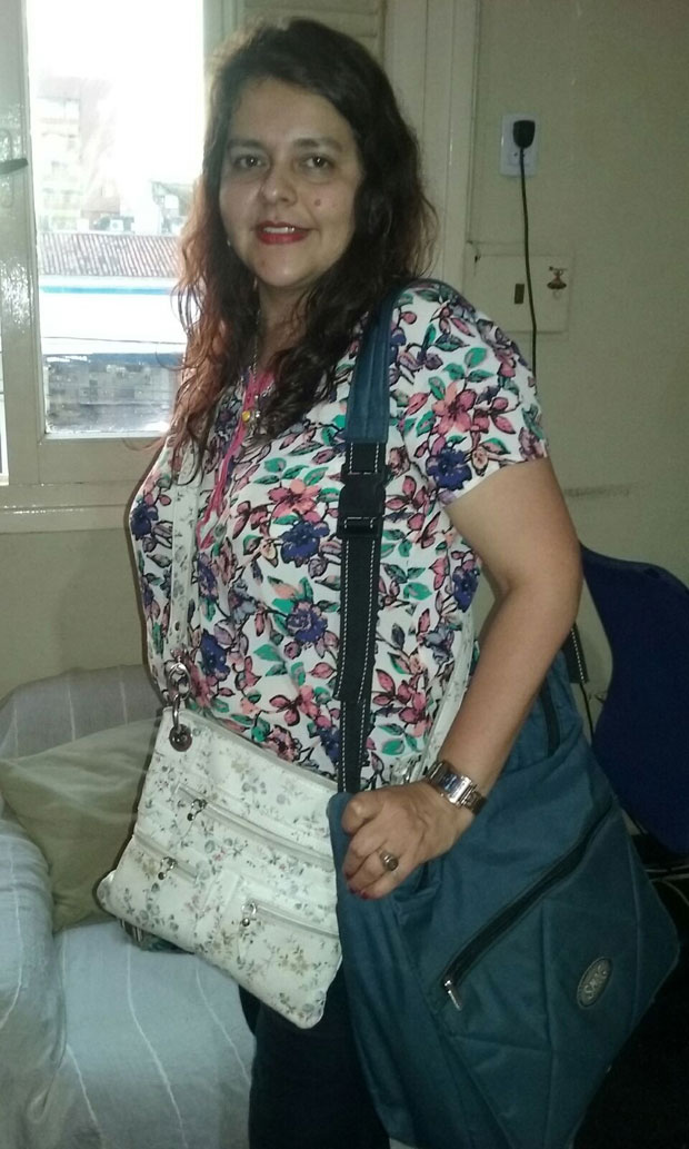 En mi cartera llevo pocas cosas… siempre uso bandoleras porque son cómodas. Hay temporadas en que cambio casi todos los días, pero ahora solo uso una para el trabajo que es la más práctica.Allí llevo mi billetera, un monedero pequeño, un encendedor, un pendrive, una sevillana cuyo fin es para defensa personal, por suerte nunca la tuve que usar. La utilicé para cortar alimentos cuando estoy fuera. También llevo las llaves de mi casa, trabajo y auto… mis anteojos, un pack de pañuelos descartables, dos lapiceras: una negra y otra azul. Un frasco pequeño de alcohol en gel, papel higiénico bien dobladito ubicado en un bolsillo… mi lápiz labial y algunos papeles en blanco por si tengo que anotar algo. Y también en un compartimiento de la cartera tengo caramelos y chicles ademas de mi tarjeta sube.Claudia además de trabajar como agente de salud en una clínica, es periodista y ahora estudia Astrología y para todo eso ocupa un ataché que es bastante pesado.