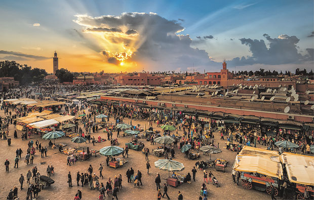 Pese a poseer numerosos monumentos patrimonio de la Humanidad, no son las edificaciones en sí las que otorgan a la ciudad su mayor atractivo. Su gente, el tráfico, los olores y la llamada al rezo son Marrakech. La ciudad cuenta con el mercado tradicional (suq) más grande del país. El zoco de Marrakech es un auténtico laberinto de callejuelas en el que hay artesanos agrupados por gremios: herreros, carpinteros, tintoreros, joyeros… son algunos de los oficios presentes. Comprar en el zoco de Marrakech es una de las experiencias más sensitivas que ofrece el país. Y el arte del regateo el mayor aliado del viajero. Tanto locales como turistas regatean en la compra de cualquier artículo y el precio final dependerá de las habilidades personales, las ganas y el tiempo de cada uno.El zoco se extiende desde el norte de la Plaza de Jamaa el Fna, magnífica de día e impresionante de noche. Dos escenarios completamente diferentes en función de la luz.También está la Kutubia, el monumento más representativo de Marrakech, visible prácticamente desde cualquier altura de la ciudad. Es una de las más grandes del occidente musulmán pero la entrada a los no musulmanes está totalmente prohibida.En el barrio de los curtidores, los hombres se sumergen en cunetas repletas de excrementos y disolventes que permiten trabajar el cuero para elaborar artículos como bolsos, cinturones y zapatos. Una forma distinta de conocer de primera mano el proceso real del tratamiento de las pieles.Marrakech es una ciudad con hoteles y alojamientos modernos y adaptados al turismo actual. Entre los establecimientos hay que destacar los riads, cuidadas casas señoriales reconvertidas en estancias donde todas las facilidades actuales conviven con una decoración tradicional y refinada. Además, gracias a su aeropuerto internacional Marrakech Menara, y las buenasconexiones por carretera, la ciudad tiene una excelente comunicación con el resto del país.