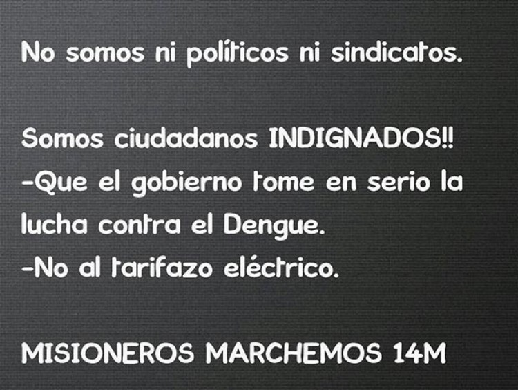 La convocatoria es clara: "El lunes 14, a partir de las 19 hs, frente a la Casa de Gobierno unite a la lucha para  que el Gobierno tome en serio el dengue. Para que no haya un sólo muerto más por esta epidemia… Y para decir basta a los tarifazos eléctricos".Aunque la misma hace referencia al rechazo al tarifazo eléctrico, no menciona si luego de manifestarse frente a Casa de Gobierno se movilizarán hacia la plaza San Martín donde a partir de las 20 horas está hecha la convocatoria de #plazallena.
