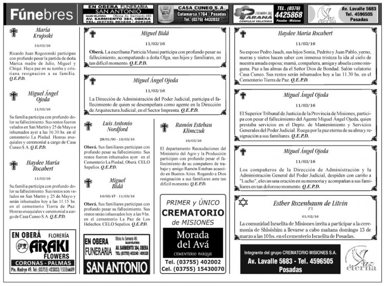Fúnebres del sábado 12 de marzo de 2016