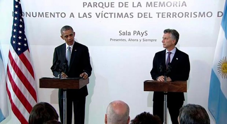 El presidente de Estados Unidos, Barack Obama, afirmó este jueves que su país "tardó en reconocer" las violaciones a los Derechos Humanos durante la última dictadura y destacó "la valentía y perserverancia" de los familiares de las víctimas que "rehusaron a abandonar esfuerzos en la búsqueda de la verdad y la justicia que se merecen". "Hemos tardado en reconocer" las violaciones a los Derechos Humanos en el caso de la Argentina, indicó Obama, quien señaló que "las democracias deben tener el valor" de revisar sus errores.Luego de recorrer el Parque de la Memoria, en la Costanera Norte, junto al presidente Mauricio Macri, Obama destacó la "valentía y perseverancia" de familiares de víctimas que "rehusaron a abandonar sus esfuerzos en la búsqueda de la verdad y la justicia que se merecen", al tiempo que resaltó la "promesa del nunca más".Obama confirmó que "como respuesta a una solicitud del presiente Macri y para seguir ayudando a que familias de las víctimas sepan la verdad" dispuso "desclasificar aún mas documentos de esta época, incluyendo por primera vez archivos militares y de inteligencia".Junto al jefe de Estado norteamericano, con quien arrojó una ofrendas florales al Río de la Plata, el presidente Macri afirmó que la conmemoración de los 40 años del golpe de Estado de 1976 es "una oportunidad maravillosa para que todos los argentinos juntos gritemos nunca más a la violencia política, a la violencia institucional"."Hoy se cumplen 40 años del golpe militar que consolidó la época más oscura de nuestra historia y como lo propuse e invité en mi discurso del 1 de marzo en el Congreso Nacional, es una oportunidad maravillosa apara que todos los argentinos juntos gritemos nunca más a la violencia política, a la violencia institucional", dijo Macri.El jefe de Estado planteó a Obama "trabajar juntos" en "defensa de estos valores en el mundo entero" y se pronunció en contra de ser "testigos pasivos de cualquier tipo de violación" a los derechos humanos."Todos los días en algún lugar del mundo se ponen en riesgo (los Derechos Humanos), por eso una vez más le agradezco esta visita a nuestro país en este día tan especial para nosotros y que nos da la oportunidad de reafirmar la posibilidad de trabajar juntos en defensa de estos valores en el mundo entero", señaló Macri.Obama, a su vez, señaló que el Parque de la Memoria se trata de "un lugar tan hermoso y movilizador en honor a las víctimas" de la dictadura, a la vez que resaltó que las "incesantes y constantes acciones" de los familiares "han marcado una diferencia"."Harán que el pasado se recuerde y que se cumpla con la promesa de nunca más", subrayó.El mandatario consideró que "enfrentar delitos cometidos por nuestros líderes y nuestra gente puede ser fuente de división y frustración" aunque es fundamental para que un país "respete los derechos de todos sus ciudadanos".Obama recordó a "aquellos que lucharon mano a mano con los argentinos por los Derechos Humanos" y en ese sentido resaltó a "los científicos que respondieron al llamado de Abuelas de Plaza de Mayo, que ayudaron a reconocer víctimas en todo el mundo".Señaló tambíen a "periodistas" que "con gran valentía informaron a pesar de las amenazas", así como a "diplomáticos", entre los que mencionó al norteamericano Tex Harris, quien documentó abusos a los Derechos Humanos.En ese sentido, destacó las polícias del expresidente norteamericano Jimmy Carter quien "entendió que los derechos humanos son un elemento fundamental de la política exterior y en ese entendimiento ha influenciado la forma" en que se vincula su país con el mundo.Fuente: Agencia de Noticias NA