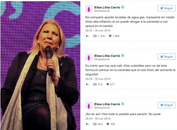 El Gobierno nacional tiene todo listo para los nuevos e inminentes cuadros tarifarios para los servicios de gas, agua y transporte. Y si bien aún no tenía determinado la fecha ni la modalidad de los incrementos, sectores de la oposición y la propia fundadora de Cambiemos Elisa Carrió salieron a cuestionar el tarifazo."No comparto los ajustes brutales de agua, gas y transporte en medio de tan alta inflación, no se puede ahogar a la sociedad que nos apoya en el cambio", manifestó Carrió en la red social Twitter.Y agregó: "Es cierto que hay que salir de los subsidios pero ¡no de ésta forma, sin pensar en la sociedad que el solo título del ‘aumento’ la angustia!""Hice todo lo posible para pararlo", agregó la diputada y concluyó: "No pude".Es que la intención de las autoridades nacionales es disminuir la incidencia que tienen los subsidios que transfiere el Estado al consumo de los servicios públicos, de manera de amortiguar el impacto en las cuentas del Tesoro.La mayor complejidad en el ajuste tarifario pasaba por los precios del gas, ya que existen distorsiones en los valores de acuerdo con el consumo en las distintas regiones del país. Al mismo tiempo, y a raíz del cobro del costo del gas importado, los incrementos serían diferenciales, ya que existen muchas medidas cautelares dictadas por magistrados en el interior del país que impiden el ajuste tarifario y la percepción de ese cargo.Sube todo en abril y mayo: agua, gas y transporteEn el caso del agua, el ajuste se aplicarían sobre los servicios que se prestan en el área metropolitana y es posible que se incluya un monto determinado para la realización de futuras obras de cloacas y agua potable.En cuanto al transporte, las autoridades habrían definido un incremento del boleto mínimo para el servicio de colectivos del área metropolitana de 3 a 6 pesos y un menor ajuste para el resto de las secciones. Para el boleto de ferrocarril de pasajeros, también en Buenos Aires, la idea que se maneja es subir el mínimo de 2 a 4 pesos e intensificar los controles ya que es muy alto el nivel de evasión, en la utilización de ese servicio en las distintas líneas. En el caso del transporte aerocomercial, el gobierno autorizará un incremento en los billetes de cabotaje con mayor incidencia para las rutas con más tráfico.Fuente: Medios Digitales