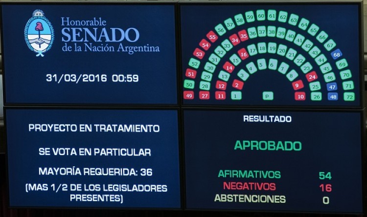 A favor: 54UNION PRO (6): Néstor Braillard Poccard, Alfredo De Angeli, Ernesto Martínez Carignano, Federico Pinedo, Laura Rodríguez Machado y Marta Varela.UNION CIVICA RADICAL (8): Julio Cobos, Silvia Elías de Pérez, Silvia del Rosario Giacoppo, Juan Carlos Marino, Alfredo Martínez, Luis Petcoff Naidenoff, Angel Rozas y Pamela Verasay.FRENTE CIVICO Y SOCIAL DE CATAMARCA (1): Oscar CastilloFRENTE PARA LA VICTORIA-PJ (23): José Alperovich, Walter Barrionuevo, Inés Blas, Salvador Cabral, Julio César Catalán Magni, Graciela De la Rosa, Carlos “Camau” Espínola, Liliana Fellner, Sandra Giménez, Pedro Guillermo Guastavino, Juan Manuel Irrazábal, Ada Rosa Iturrez de Cappellini, Sigrid Kunath, María Laura Leguizamón, José Miguel Mayans, Dalmacio Mera, Beatriz Mirkin, José “Nato” Ojeda, Omar Perotti, Miguel Angel Pichetto, Marina Riofrío, Rodolfo Urtubey y Gerardo Zamora.COMPROMISO FEDERAL (3): Liliana Negre de Alonso, Adolfo Rodríguez Saá y Roberto Basualdo.FRENTE POPULAR SALTEÑO (1): Juan Carlos RomeroSANTA FE FEDERAL (1): Carlos Alberto ReutemannPERONISMO PAMPEANO (2): Norma Durango y Daniel Lovera.MOVIMIENTO POPULAR NEUQUINO (2): Carmen Lucila Crexell y Guillermo Pereyra.PARES (1): María Cristina Fiore ViñualesUNION POR CORDOBA (1): Carlos CaserioCHUBUT SOMOS TODOS (1): Alfredo LuenzoMOVIMIENTO POPULAR FUEGUINO (1): Miriam BoyadjianFRENTE POPULAR (1): Gerardo MontenegroGEN (1): Jaime LinaresFEDERALISMO Y LIBERACION (1): Carlos Saúl MenemEn contra: 16FRENTE PARA LA VICTORIA-PJ (16): Juan Manuel Abal Medina, Eduardo Aguilar, Hilda Aguirre, Ana Almirón, Anabel Fernández Sagasti, Marcelo Fuentes, Virginia García, Silvina García Larraburu, Ruperto Godoy, Nancy González, María Ester Labado, Mirtha Teresita Luna, Juan Mario País, Daniel Pérsico, María Inés Pilatti Vergara y María de los Angeles Sacnun.Ausentes: 2FRENTE PROGRESISTA CC-ARI (1): María Magdalena OdardaPROYECTO SUR (1): Fernando “Pino” SolanasFuente: Parlamentario.com