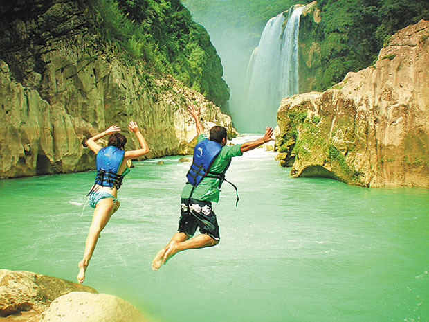 Pocos conocen a fondo la Huasteca, tierra mexicana por descubrir. Abarca parte de los estados de Veracruz, San Luis Potosí y Puebla, y es completamente diferente del resto del país porque no espera la temporada de lluvias, en las sierras de la Huasteca llueve regularmente todo el año, por lo cual siempre está verde y cubierta por una vegetación selvática.Por la misma razón allí se encuentra la mayor concentración de ríos y torrentes del país; cada pueblito, cada rincón está cruzado por dos o tres ríos de montaña de aguas cristalinas y frescas, y esto se vive como un milagro de abundancia en este México, frecuentemente sediento y de cauces secos.Si viaja desde el desierto del altiplano central hacia el norte, el turista se encontrará con los paraísos acuáticos de los que tanto se habla. La Huasteca esconde tal cantidad de maravillas naturales que es un objetivo extraordinario. Rafting y kayac, rappel en cañones, espeleología, exploración de ríos subterráneos, cuevas y sótanos, algunos mundialmente famosos como el Sótano de las Golondrinas, son sólo algunas de las actividades que se pueden realizar en esta zona.TamulEl tesoro de la Huasteca potosina es la Cascada de Tamul, nada menos que el salto más espectacular de México. Se forma por el Río Gallinas, de aguas verdes y caudalosas, que se precipita desde una altura de 105 metros sobre el Río Santa María, que corre en el fondo de un cañón estrecho y profundo de paredes rojizas. En su momento de mayor caudal la caída puede alcanzar hasta los 300 metros de ancho.El encuentro violento de los dos ríos da origen a un tercero, el Tampaón, de aguas increíblemente turquesas, donde se practican las más bellas bajadas en balsa (rafting) del país, según dicen los entendidos.Para llegar hasta esta maravilla es necesario navegar en lancha y admirarla desde abajo. Otra opción es llegar a la parte superior por el poblado de El Sauz. Sin duda, un lugar de peregrinación para los amantes de los deportes extremos. En la cascada de Tamul se puede nadar, acampar, hacer senderismo, ciclismo o rappel junto a la gran caída. Allí está muy de moda la práctica del “Cascading”, que consiste en saltar cascada por cascada, con la protección de un casco y un chaleco salvavidas. Es ideal también para el kayak siendo catalogado como el “Disneylandia” de los kayakistas por la concentración de las cascadas.De camino está “El Sótano de las Golondrinas“, abismo catalogado como el 6° más profundo del mundo con sus 376 metros de altura. Sin duda, un lugar donde descargar adrenalina y el preferido de millones de aventureros fanáticos de la caída libre.Cueva del AguaPara llegar a la Cueva del Agua hay que atravesar el río Santa María en camino a la Cascada de Tamul. Es una cueva de unos quince metros (ancho y largo) de grande, con agua tibia y clara.Tiene muchos murciélagos. Han hecho investigaciones para saber cuánto tiene de profundidad y nunca lo han descubierto.Se trata de una cavidad en la ladera de la Sierra Madre Oriental inundada de agua cristalina que a la luz del sol adquiere una tonalidad turquesa. El lugar es paradisíaco adornado por enormes estalactitas que provocan un escenario único en su género.Para llegar hay que subir unos 20 metros entre la selva, piedras y arena. La llegada tiene su recompensa.El lugar es ideal para refrescarse y nadar.