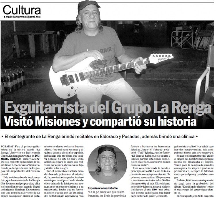 El guitarrista Raúl "Locura" Dilelio, uno de los miembros fundadores de La Renga, falleció en las últimas horas por un problema de salud que lo aquejaba.El deceso se produjo el viernes, mismo día que la banda oriunda de Mataderos subieron a las redes sociales la leyenda "Buen viaje Locura" acompañada con una foto de un recital, en el que estaban Dilelio y el resto de los integrantes de la banda.Asimismo, como una especie de ironía de la vida, el primer guitarrista que tuvo La Renga murió el mismo día que Gustavo "Chizzo" Nápoli, el otro fundador de la banda, cumplía 49 años.El grupo surgió en 1988 con "Chizzo" en voz, "Locura" Dilelio en guitarra, Jorge "Tanque" Iglesias en batería y Gabriel "Tete" Iglesias en bajo, tocando covers de bandas como Creedence, Vox Dei y Manal.Sin embargo, "Chizzo" y "Locura" se conocían desde antes y ya en la casa de Dilelio hacían covers con el primer bosquejo de La Renga, que se llamaba Cólera."Yo le enseñé a Chizzo  a tocar la guitarra", contó "Locura" varias veces hasta que el líder de la banda supo consolidarse como única guitarra y voz, tras la salida de Dilelio por problemas personales.  La Renga nació con el ingreso de los hermanos Iglesias y "Locura" participó solamente en el primer disco del grupo, "Esquivando charcos", de 1991, una versión casera en casete que años más tarde lograron editar para sacar en CD.A ese grupo se sumó Gabriel "Chiflo" Sánchez en saxofón, por lo que en un momento fue un quinteto.Fuente: Noticias ArgentinasLEA LA ENTREVISTA DE PRIMERA EDICIÓN HACIENDO <a href="http://www.primeraedicion.com.ar/nota/211861/yquot%3Blocurayquot%3B-rockera-en-misiones.html">CLICK AQUÍ</a>