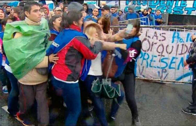 Miles de manifestantes se encuentran apostados en las diferentes manos que tiene la avenida Comodoro Py, en los Tribunales Federales de Retiro, a la espera de la llegada de la ex presidenta Cristina Fernández de Kirchner quien deberá declarar a las 10 ante el juez Claudio Bonadio en la causa que investiga la venta de dólar futuro.En el lugar fue agredida la periodista del grupo Clarín Mercedes Ninci, quien fue arrastrada por un grupo de mujeres identificadas con chalecos con la inscripción "Organización" de La Cámpora.Las columnas, que se habían comenzado a congregar a partir de las 5.30 de la mañana en diferentes puntos de la Ciudad de Buenos Aires, arribaron alrededor de las 7 a los tribunales, organizadas por los diferentes organizaciones políticas, sociales y gremiales.A las manifestación organizada se suma la presencia de cientos de personas de a pie que con paraguas en mano se suman a la convocatoria bajo el lema "El 13A todos con Cristina".Banderas de diferentes colores flamean en medio de clásicos puestos de choripán y bondiola a los que se suman la venta callejera de pilotos de plástico y paraguas en medio de la llovizna suave y constante que no cesó en toda la mañana.En tanto, un escenario montado en la puerta de la parroquia Stella Maris, se levanta con la expectativa de que luego de la declaración de la exmandataria ante el juez, se pueda escuchar un mensaje, posibilidad que fue explicitada y no descartada en un reportaje radial por el diputado del FPV, Andrés Larroque.Completan el panorama globos aerostáticos, el sobrevuelo de drones y puestos callejeros donde se venden remeras con los rostros de los expresidentes Néstor y Cristina Kirchner.Entre las organizaciones presentes se encuentran el Movimiento Evita, La Cámpora, Miles, Kolina, la CTA, Encuentro Popular, Uocra, Movimiento Territorial de Liberación, Movimiento Oktubres, la Corriente Martín Fierro, el Partido Comunista Revolucionario, el Partido Intransigente, y los radicales pertenecientes a la agrupación Irrompibles a los que se suman el Frente Grande y el Peronismo para la Victoria, entre otras.Entre los dirigentes que ya llegaron a las inmediaciones de los tribunales de Retiro se encuentran el exjefe de gabinete Aníbal Fernández, los exministros Agustín Rossi y Axel Kicillof y el jefe del bloque de diputados del Frente para la Victoria Héctor Recalde.La concentración cuenta además con la presencia de decenas de medios de comunicación, nacionales e internacionales, colectivo compuesto por móviles de televisión, prensa gráfica y radios, y portales.Fuente: Agencia de Noticias Télam