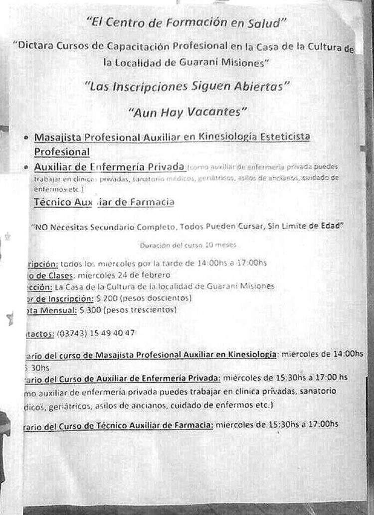 Todas las dudas que tenían se confirmaron el pasado lunes 11 de abril, cuando PRIMERA EDICIÓN hizo público el hecho de que continuaban dictándose cursos de auxiliar de enfermería en algunas localidades del interior de la provincia, pese a que esta carrera no se dicta más en el país desde el 2000 y que los mismos no se encuentran avalados por el Ministerio de Salud Pública. “Yo tenía mis sospechas, porque la persona que los dictaba ni siquiera nos dijo qué título habilitante tenía”, aseguró Alejandra Saucedo a PRIMERA EDICIÓN. Alejandra ya había pagado el costo de la inscripción y las cuotas correspondientes a los tres días de clases que tuvo. Era alumna del curso que se dictaba en Candelaria, por lo menos hasta el martes pasado, cuando las alumnas increparon a la docente encargada del instituto y le exigieron que muestre la documentación habilitante para llevar a cabo el mismo. “Una empresa privada había alquilado el salón del CIC, que se alquila para cuestiones comunitarias. Presentaron una documentación que acreditaba la inscripción en el SPEPM y comenzaron a dar los cursos”, indicó Daniel Luna, intendente de Candelaria a este Diario. “Hace un mes que le vengo pidiendo la información sobre esos cursos y luego de la publicación en PRIMERA EDICIÓN, se le exigió en forma firme la documentación y la mujer se hizo la ofendida y dijo que iba a buscar un lugar privado, que no quería estar más en el CIC, lo que nosotros vimos con agrado. Pero cuando fue a dar el curso, todas las mujeres que eran sus alumnas por poco no la linchan”, agregó el funcionario.Fueron alrededor de 60 mujeres, según Luna, quienes increparon a la mujer y exigieron una solución. Sucede que los costos para el dictado de este tipo de cursos no suelen ser accesibles, por lo que consideraron una estafa a su buena fe. “Carla Acosta se dice titular de la Academia de Capacitación Néstor Kirchner, con registro de SPEPM número 105, que es la presentación que hicieron en el SPEMP para la habilitación. Nosotros le exigíamos esta habilitación, pero nunca nos traía y como ese curso ya se había dado en la gestión anterior, le dimos continuidad pero pedíamos la documentación que nunca nos traía. A raíz de todo esto, se llegó a este desenlace”, indicó Luna. No fue el municipio quien procedió a cerrar el curso, tampoco lo hizo el Ministerio de Salud Pública ni el Colegio de Enfermeros. Cansadas y estafadas, las alumnas fueron quienes pidieron explicaciones y no dejaron que se dicte ni una clase más. ¿Quién es el responsable de evitar que esto suceda? ¿Tan fácil es de estafar a un grupo?La voz de Salud PúblicaDesde el Ministerio de Salud Pública aseguraron que no tenían conocimiento de que este curso se esté dictando, pero volvieron a pedir a la gente que antes de pagar, se certifique que el curso esté habilitado por Salud Pública. “No hay más escuelas para la formación de este recurso humano”, señaló a PRIMERA EDICIÓN Marisa Cañete, del Departamento de Enfermería del Ministerio provincial. Indicó que “nosotros no pregonamos más la creación de cursos de auxiliares de enfermería desde el año 2000. No se aprueban por más que traigan programas o currículas, no por capricho, si no por una política de Estado para la formación del recurso humano en enfermería”, destacó. Cañete señaló que hay mucha gente que se acerca al Ministerio después de que el Colegio de Enfermeros, encargado de regular y habilitar los títulos para ejercer la profesión en Misiones, les rechaza el certificado. “Si estos títulos no son reconocidos por el Ministerio de Salud Pública ellos no los matriculan”. Sobre los cursos, consideró que “engañan a la gente que busca una salida laborar rápida, pero nosotros no podemos jugar con la salud de la población”.En Guaraní, otro en la miraSorprendentes similitudes a Candelaria pudo encontrar PRIMERA EDICIÓN en Guaraní. “La persona que lo dicta se llama Carla, es una despachante de aduana”, relató a este Diario Yessica Alvez de Olivera, de 23 años, una de las alumnas que dejó la “carrera” de enfermería para empezar otra. Pero su hermana de 21 todavía concurre a la Casa de la Cultura de Guaraní, a pocos kilómetros de Oberá, todos los miércoles al curso. Yessica, al leer la nota, se comunicó con el Ministerio quien le avisó que auxiliar de enfermería no se dictaba más. “Siempre sospechamos porque nos da una fotocopia por clase. Después buscamos en internet y todo está ahí. Las prácticas eran entre nosotros, ya hicimos una sobre la colocación de penicilina y tuvimos que llevar las jeringas y practicamos entre nosotros, sentados en el salón”.Como en Candelaria, el lugar era un lugar de uso público: en Guaraní el curso se dicta en la Casa de la Cultura. “Le pedí toda la documentación, pero no tenía”, aseguró Miguel Ángel Vargas, intendente de Guaraní, quien además dijo no tener conocimiento de que personas ya hayan abonado el valor del mismo, como pasó con Yessica y su hermana. “No están autorizados para el dictado del curso”, cerró.