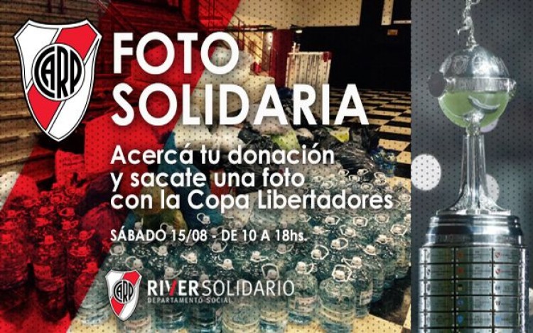 Para ayudar a los afectados por la inundaciones en la provincia de Buenos Aires, el club River Plate realizará una acción en las inmediaciones del Monumental, para que todos las personas solidarias, que así lo quieran, puedan acercarse, colaborar y sacarse una foto con la Copa Libertadores de América.Por ello, este sábado de 10 a 18 horas, el camión "La Máquina" estará en la puerta del Club (sobre Figueroa Alcorta, en la CABA) exhibiendo el trofeo para que los interesados puedan fotografiarse y vivir la emoción junto a la Copa a cambio de una donación.Tanto socios como no socios pueden acercar donaciones de todo tipo (preferentemente lavandina, frazadas, pañales y agua mineral) y, de esta manera, ayudar a los damnificados, indicó el club millonario desde su pagina oficial.